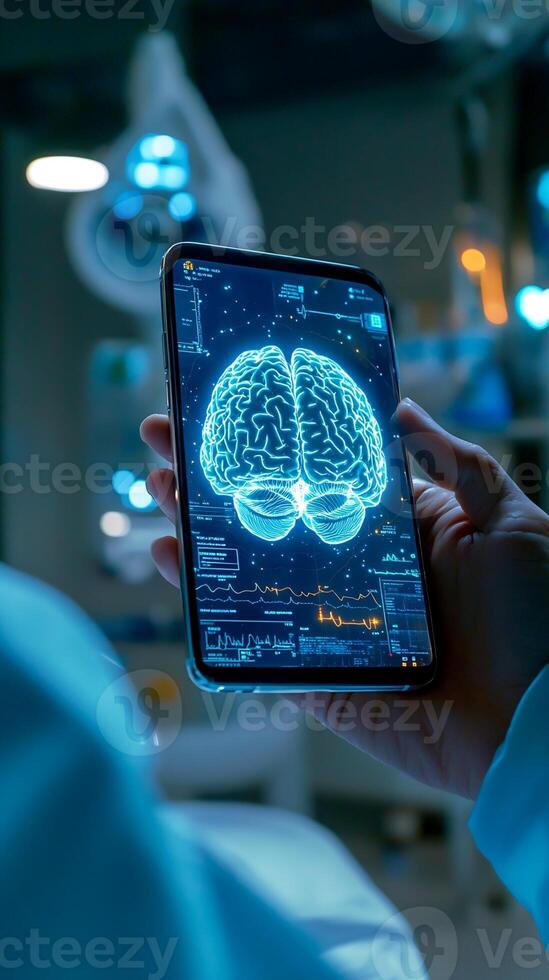 Smartphone Displaying 3D Brain Model and Medical Data in Surgical Setting Pro Photo