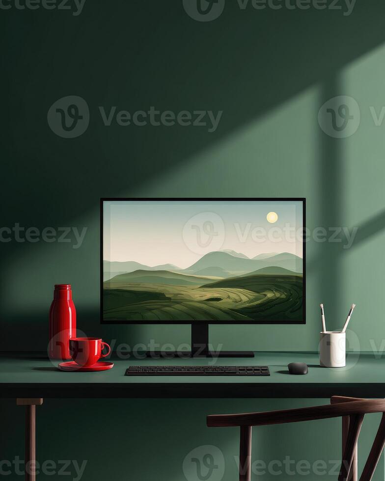 A computer monitor sitting on a desk in front of a window Pro Photo