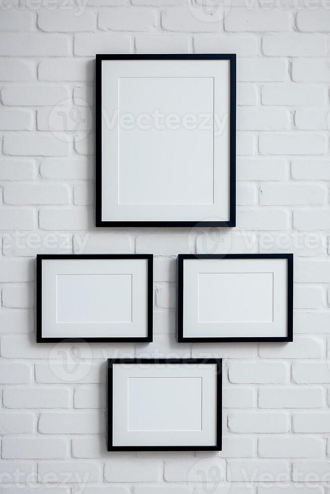 Minimalistic composition of four empty picture frames hanging on a white brick wall. Frames of different sizes. Universal image for layouts and design projects. Pro Photo