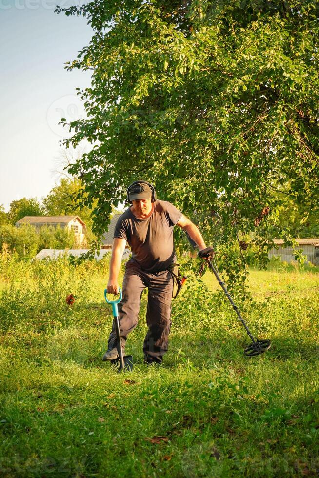 A man uses a metal detector in a green field, focused on finding hidden objects in the grass under the warm light of late afternoon. The area is surrounded by trees and distant structures Pro Photo
