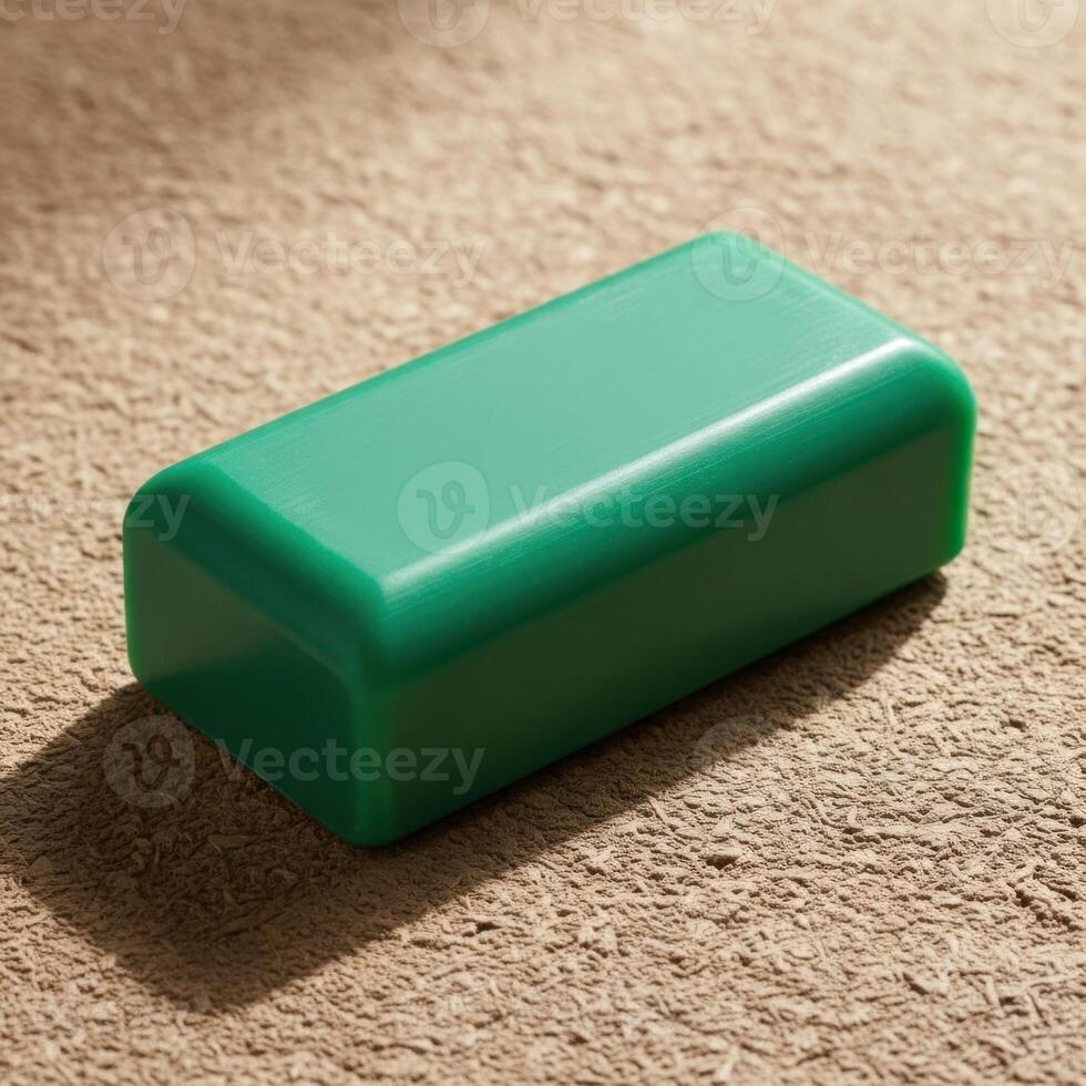 A smooth rectangular solid green object with rounded edges sits on a textured surface isolated on white background Pro Photo
