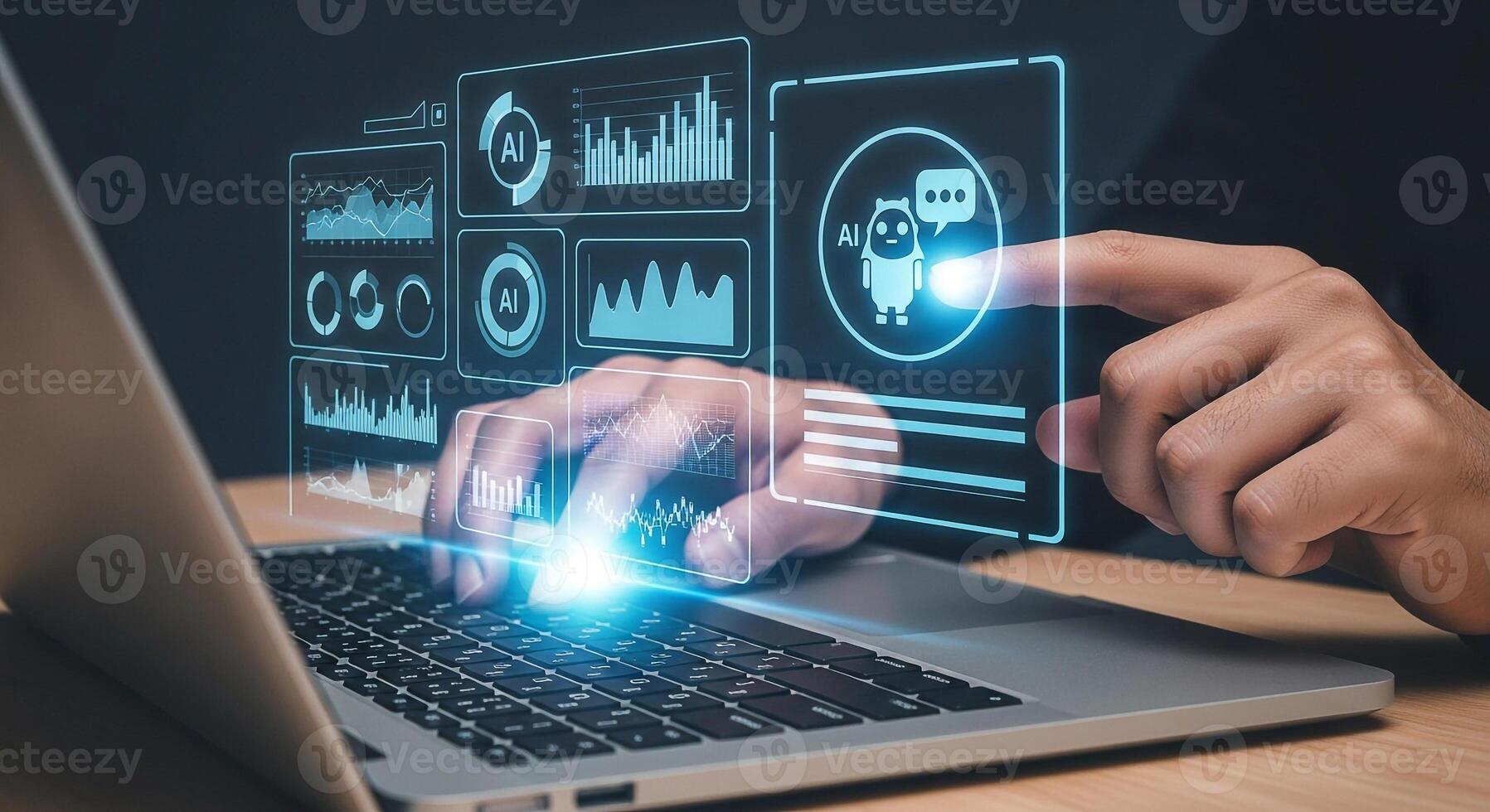 Person interacting with a futuristic AI interface on a laptop analyzing data and charts in a modern office setting showcasing innovative technology and digital transformation Pro Photo