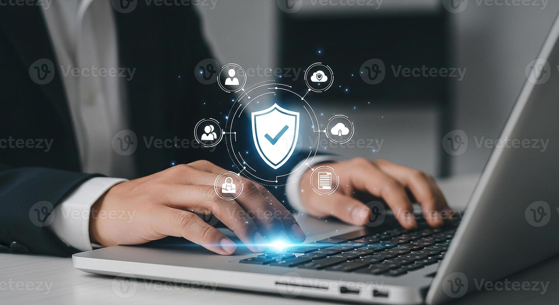 Businessperson working on laptop implementing cybersecurity measures ensuring data protection and privacy in modern office Image depicts digital shield cloud security and user privacy icons Pro Photo