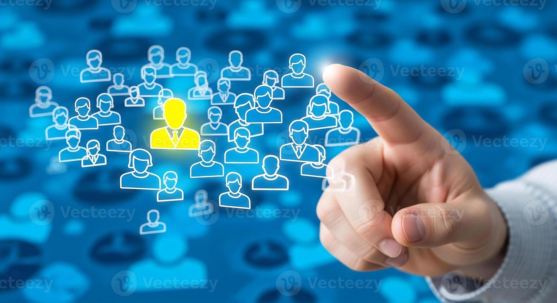 Hand selecting a digital profile from a network of people symbolizing recruitment talent acquisition or human resources management in a technological context This image evokes concepts of networking c Pro Photo