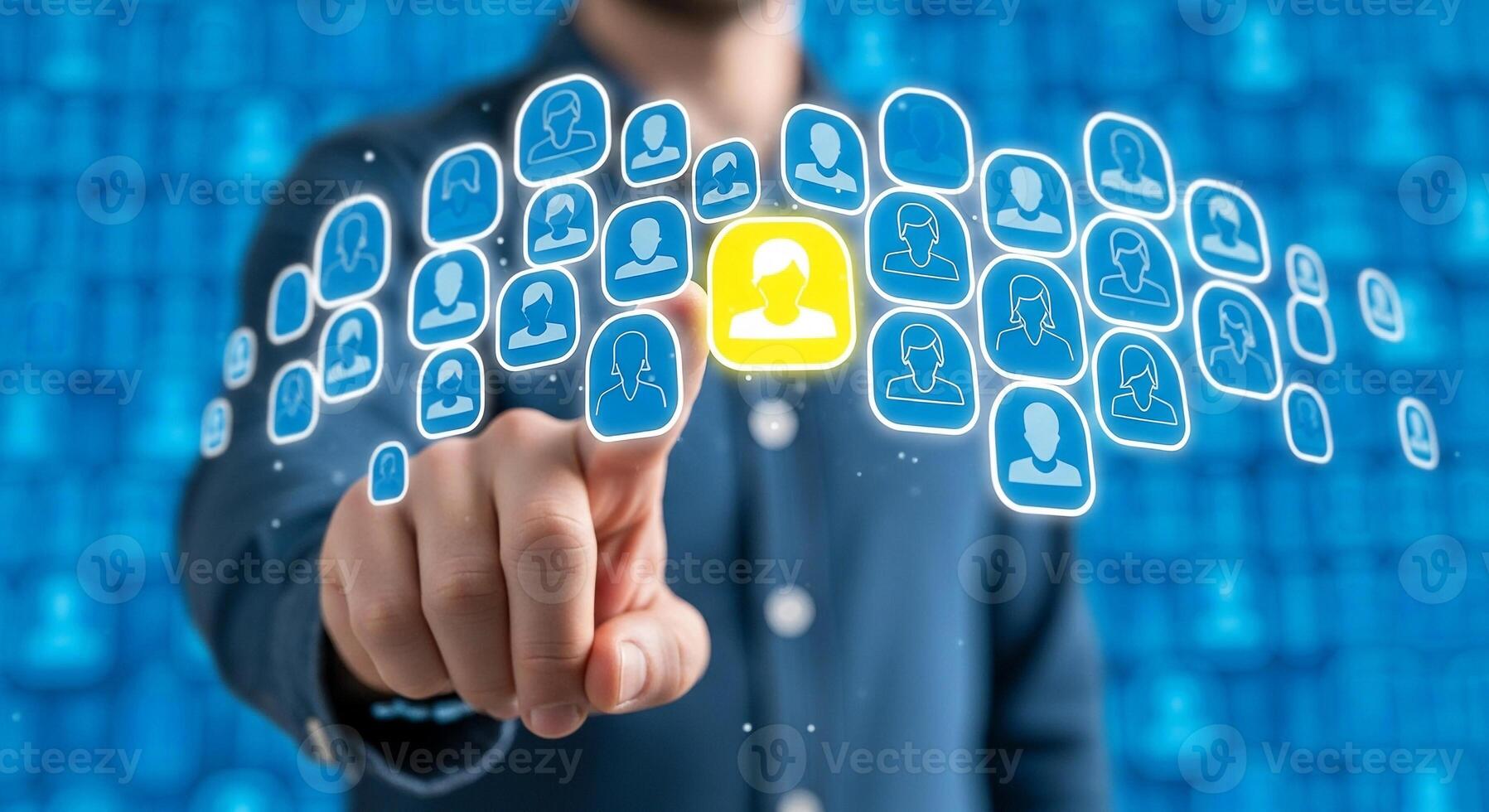Man Selects a Profile from a Network of Digital Icons Highlighting the Concept of Human Resources Recruitment and Networking in a Modern Technological Setting Pro Photo