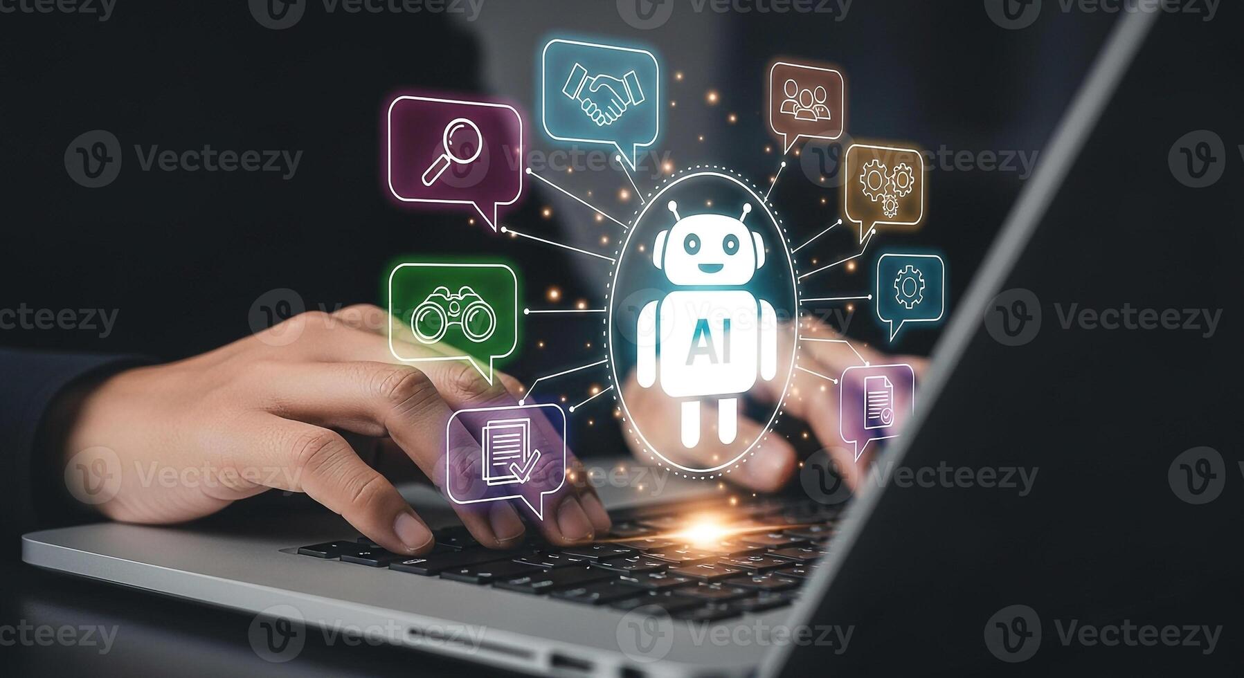 Person using laptop computer interacts with AI interface showing digital icons of teamwork communication and research signifying innovative technology and digital transformation in modern business Pro Photo