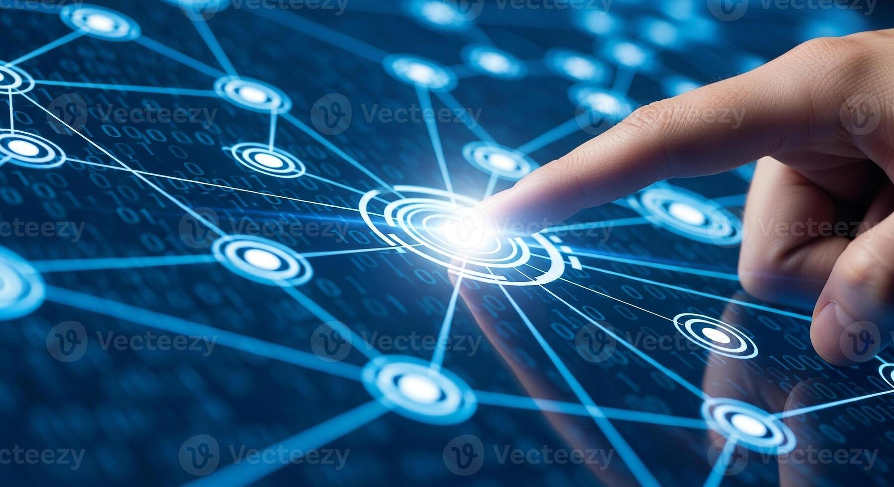 Fingertip interacting with a digital network interface showcasing futuristic technology and global connectivity The image evokes a sense of innovation progress and the interconnected world of data and Pro Photo