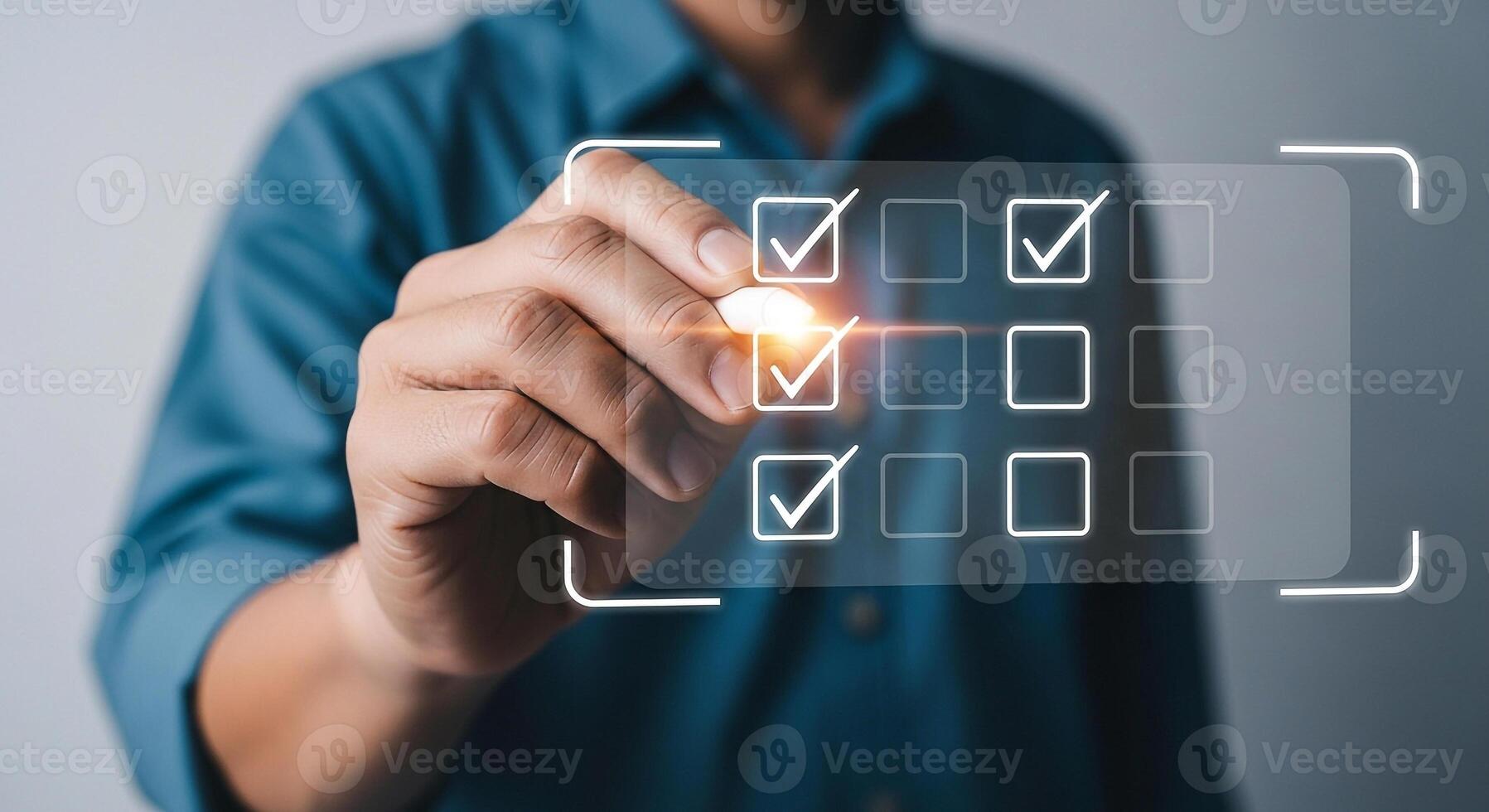 Person checking items off a digital checklist completing tasks and achieving goals in a modern workspace representing productivity and success Pro Photo