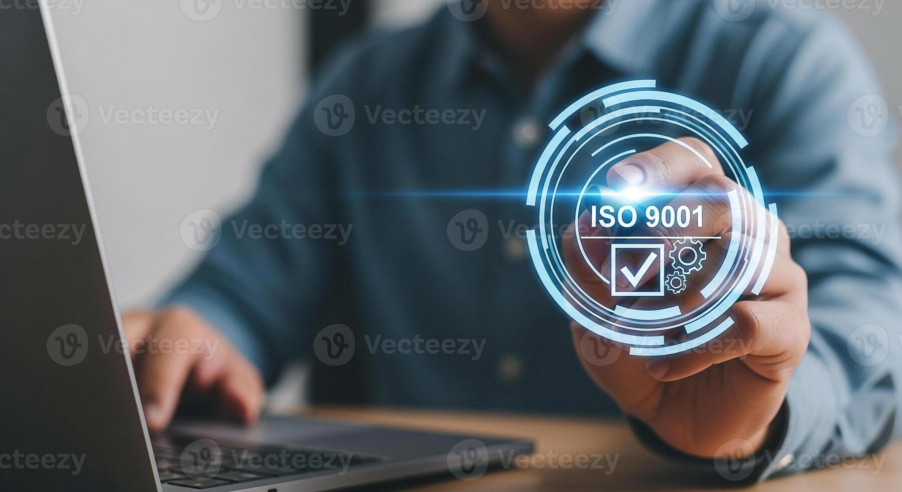 Businessperson working on laptop computer in modern office actively selecting ISO 9001 quality management system certification on a digital interface signifying commitment to excellence and business s Pro Photo