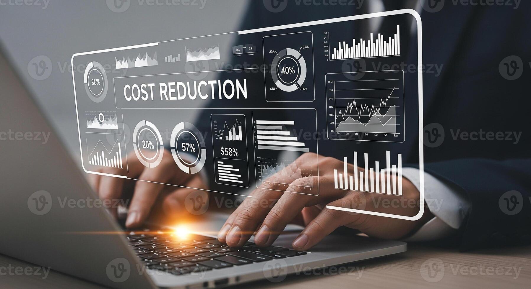 Businessman analyzing cost reduction strategies using a laptop computer with holographic charts and graphs in a modern office setting symbolizing financial planning and efficiency Pro Photo