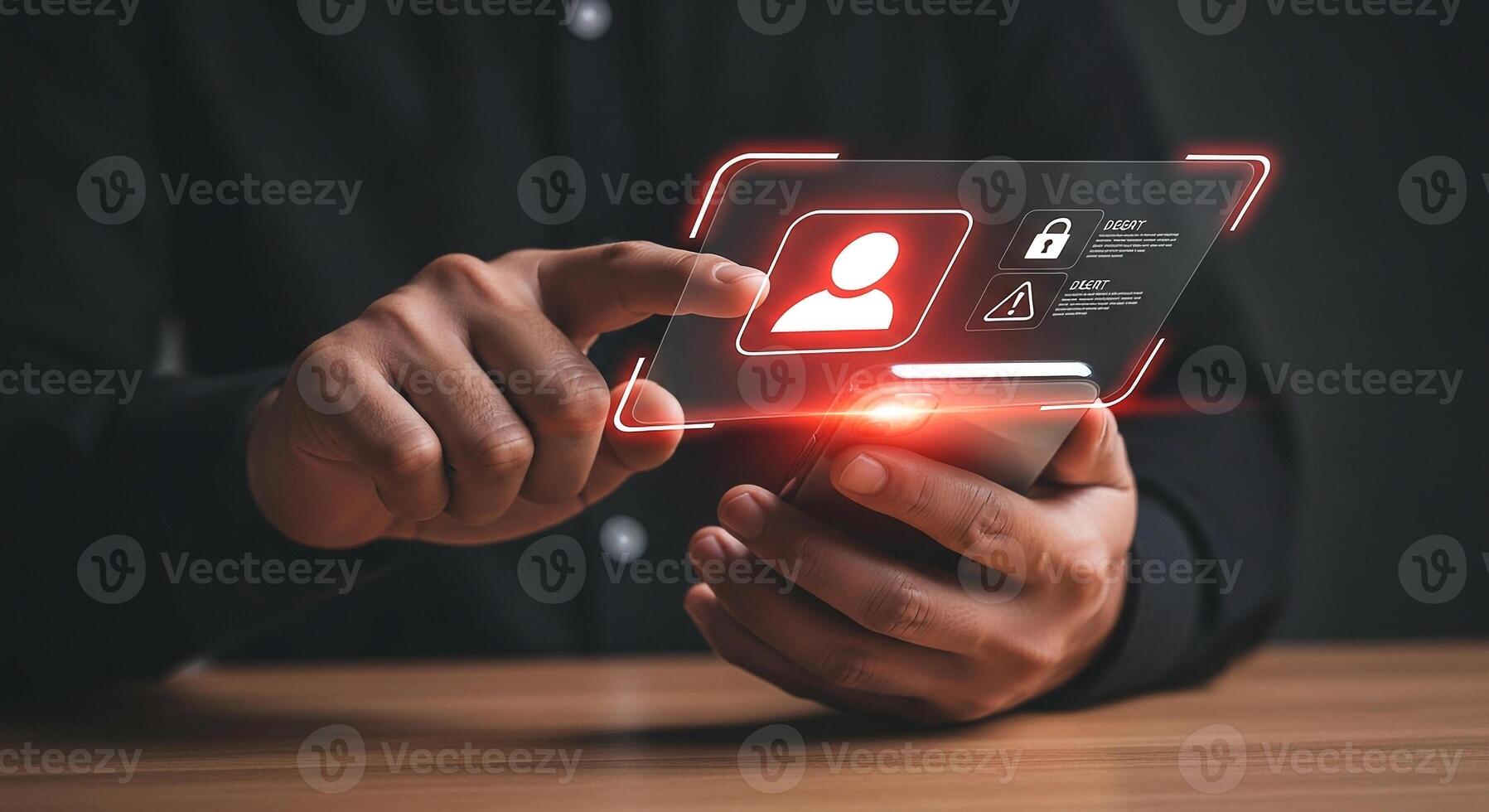Person using a smartphone to access a digital security interface with a profile, lock, and alert icons, signifying online privacy and data protection at a desk Pro Photo