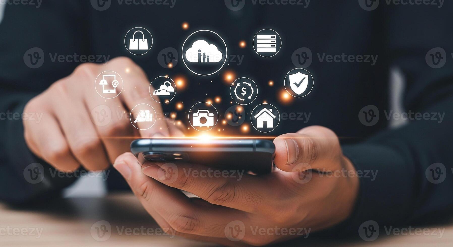 Person using smartphone to access digital services, showcasing cloud computing, online shopping, home automation, and security features, all within a modern technological setting The image evokes feel Pro Photo
