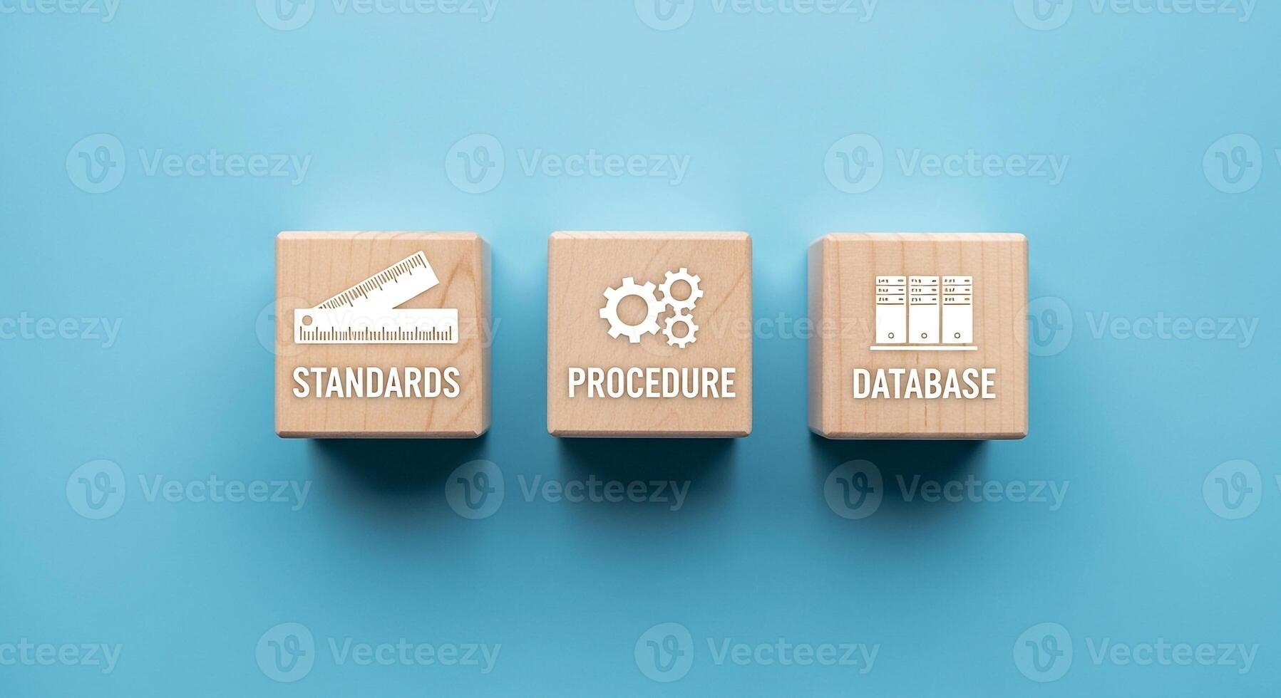 Wooden blocks with standards, procedure, and database icons on a blue background, symbolizing essential business compliance and data management Pro Photo