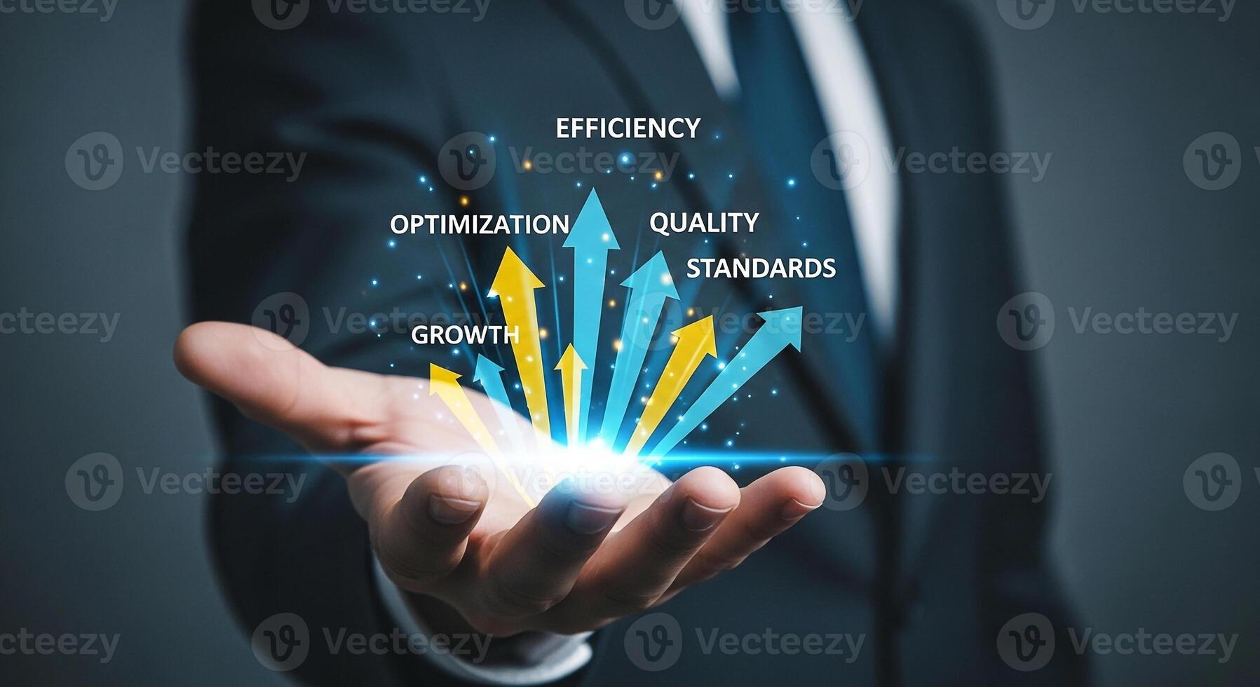 Businessman Presenting Growth, Optimization, Quality, and Efficiency in a Modern Office Setting The upward-pointing arrows symbolize progress, success, and achieving business goals Pro Photo