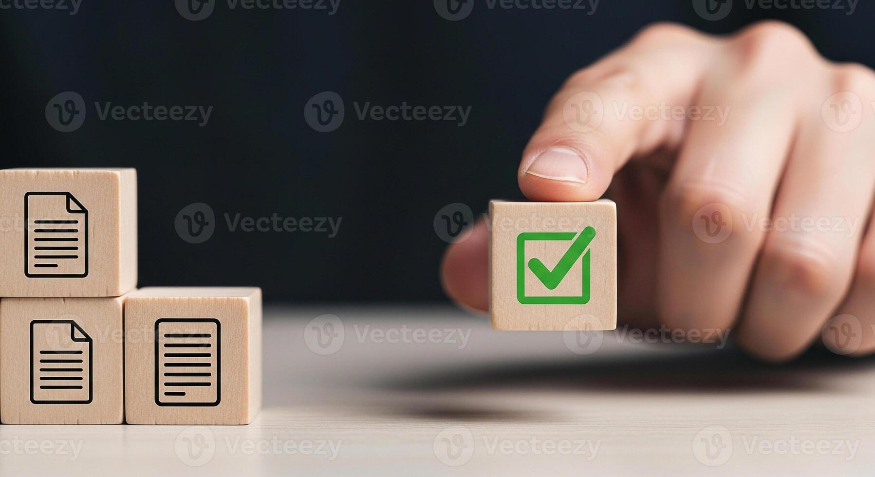 Hand placing a wooden block with a check mark on a table, symbolizing project completion and successful task management The blocks represent documents and files, highlighting the concept of efficient Pro Photo