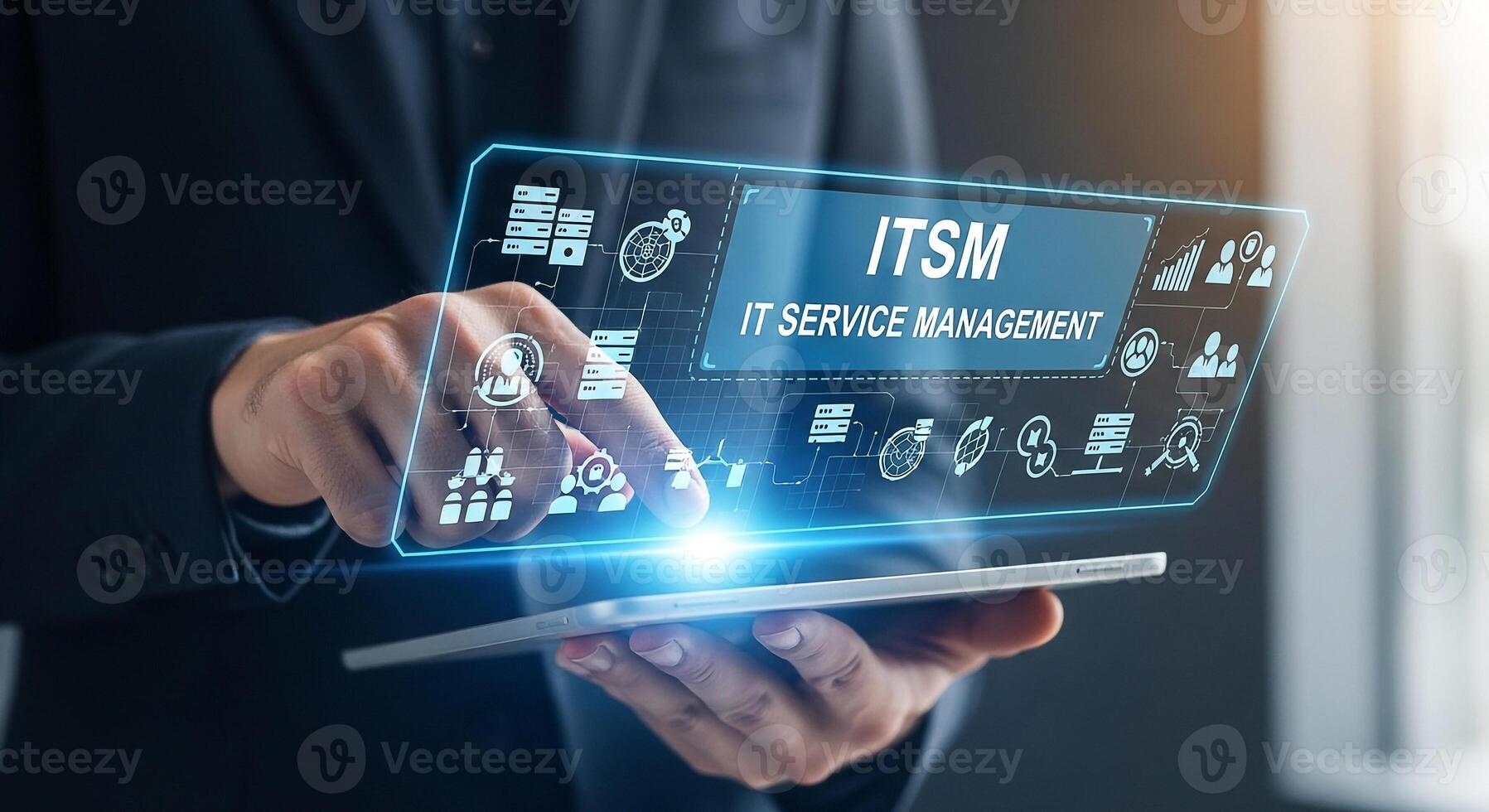 Businessman using digital tablet, interacting with IT Service Management ITSM interface, showcasing modern technology and efficient workflow in a professional office setting Pro Photo