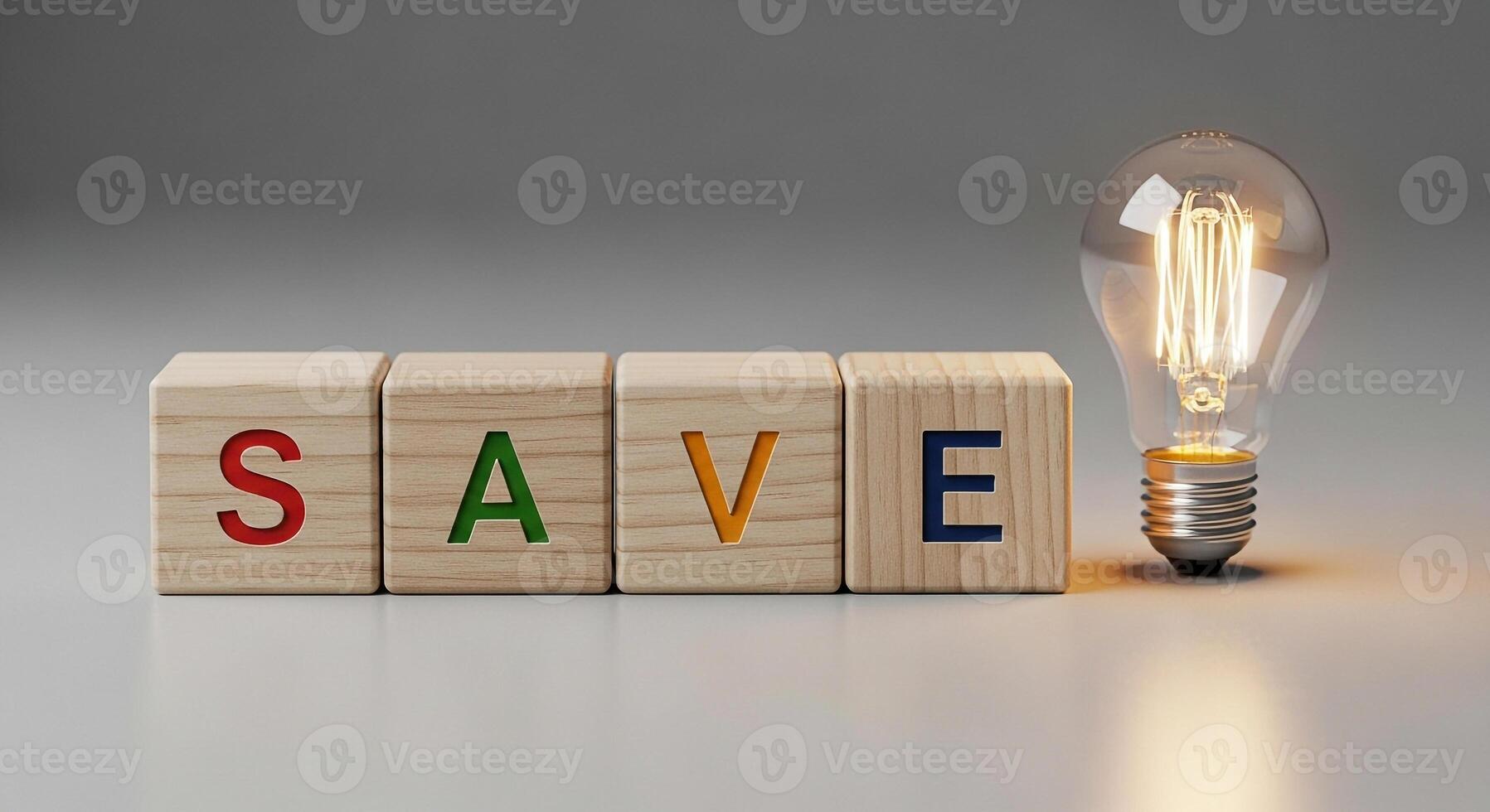 Wooden blocks spelling SAVE next to a glowing lightbulb on a gray background, symbolizing energy efficiency and cost savings Pro Photo