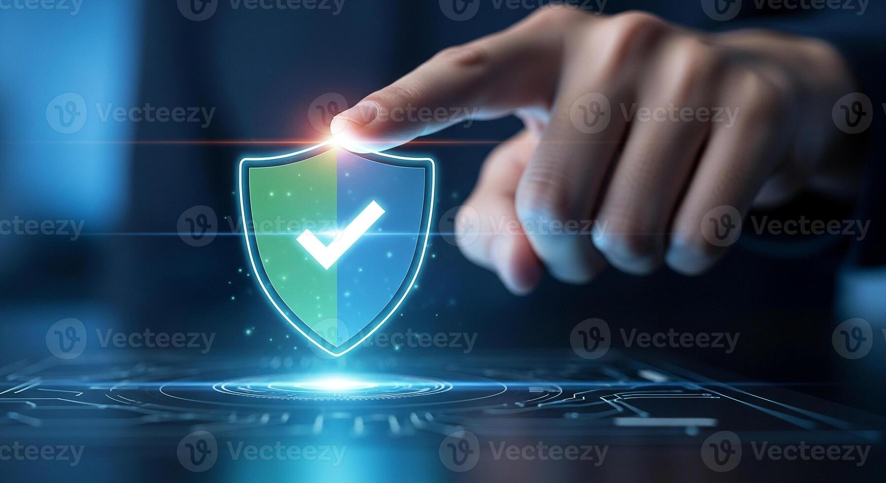 Hand activating a digital shield with a check mark, signifying security and protection in a futuristic technological environment The concept represents cybersecurity, data privacy, Pro Photo