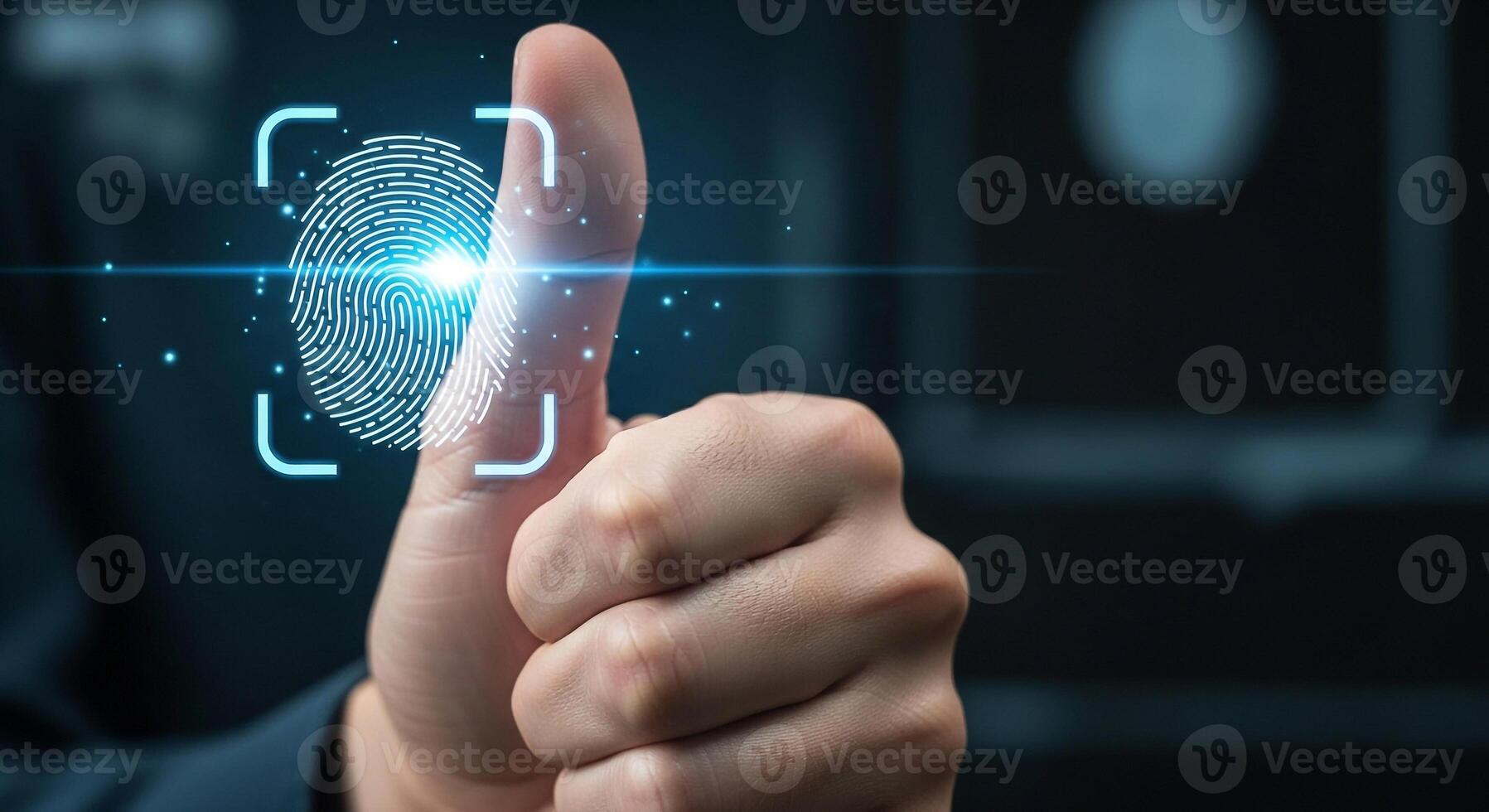 Person using thumb fingerprint scanner for biometric authentication, futuristic digital technology, secure access, privacy concept Pro Photo
