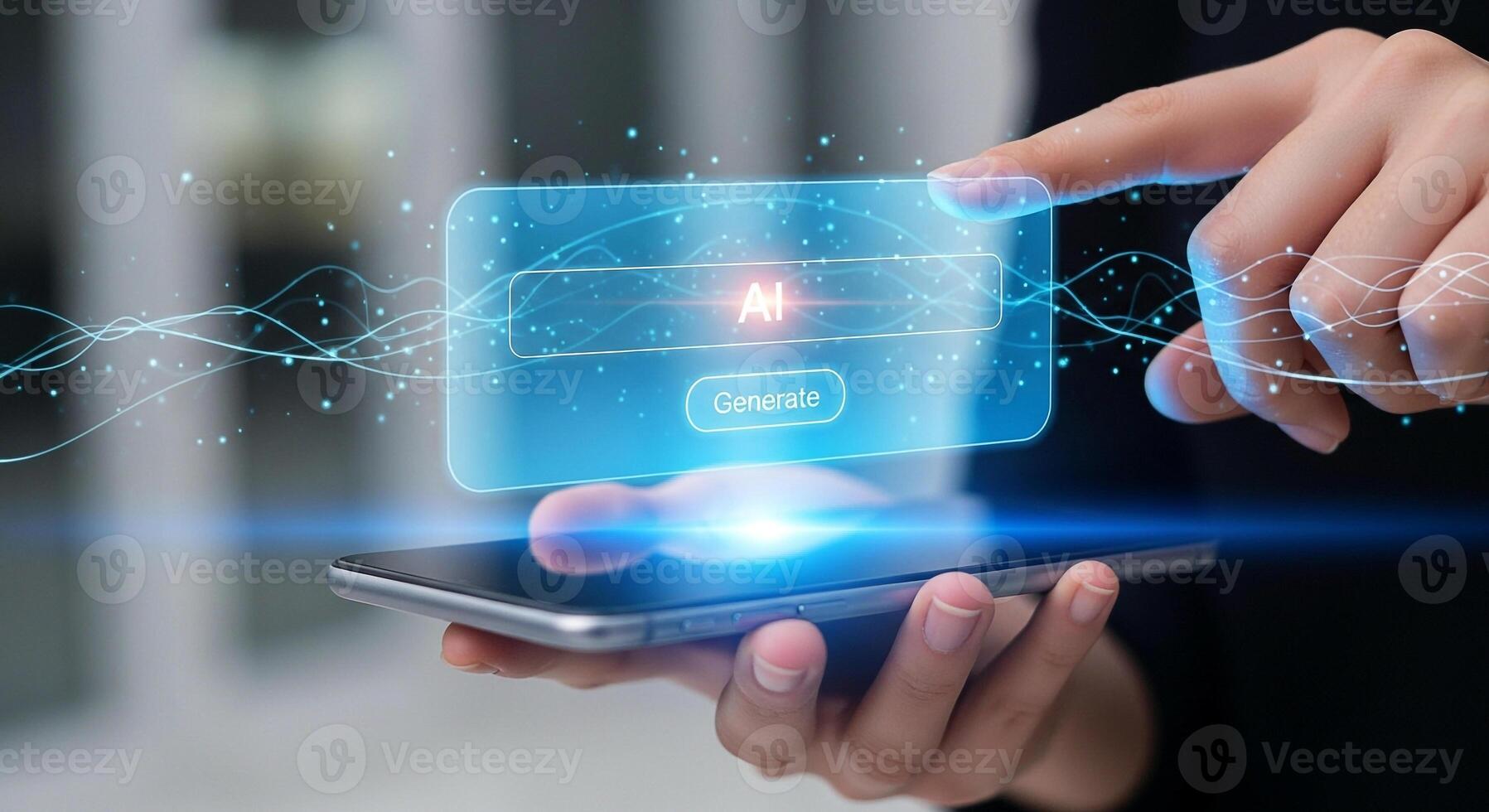 Person using AI technology on smartphone, generating data in a futuristic digital workspace Innovative, modern concept Pro Photo