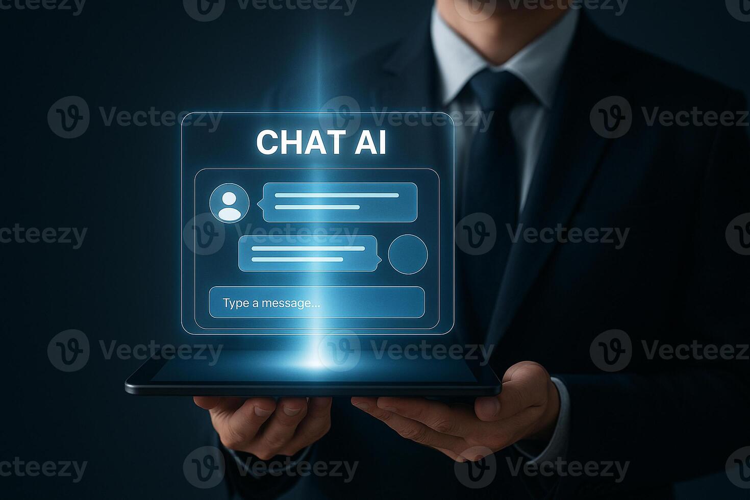 Businessman using a tablet to access a futuristic chat AI interface showcasing innovative technology and digital communication in a modern business setting The image evokes a sense of technological ad Pro Photo