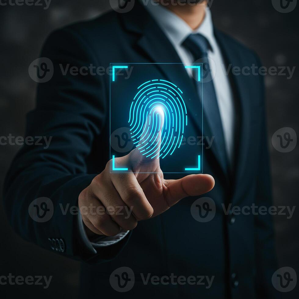 Businessman using biometric fingerprint scanner for secure access digital security and authentication concept Pro Photo