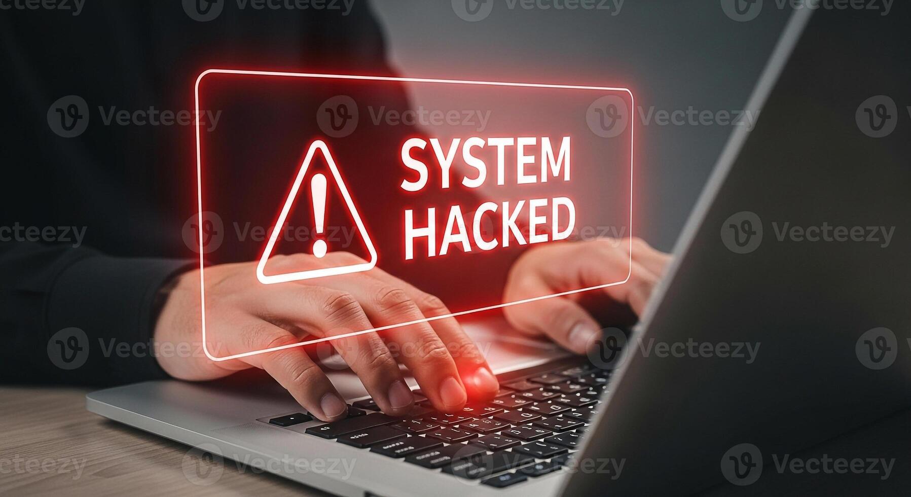 Person using laptop computer experiencing a system hack alert a digital security breach on screen urgent cybersecurity concept image Pro Photo
