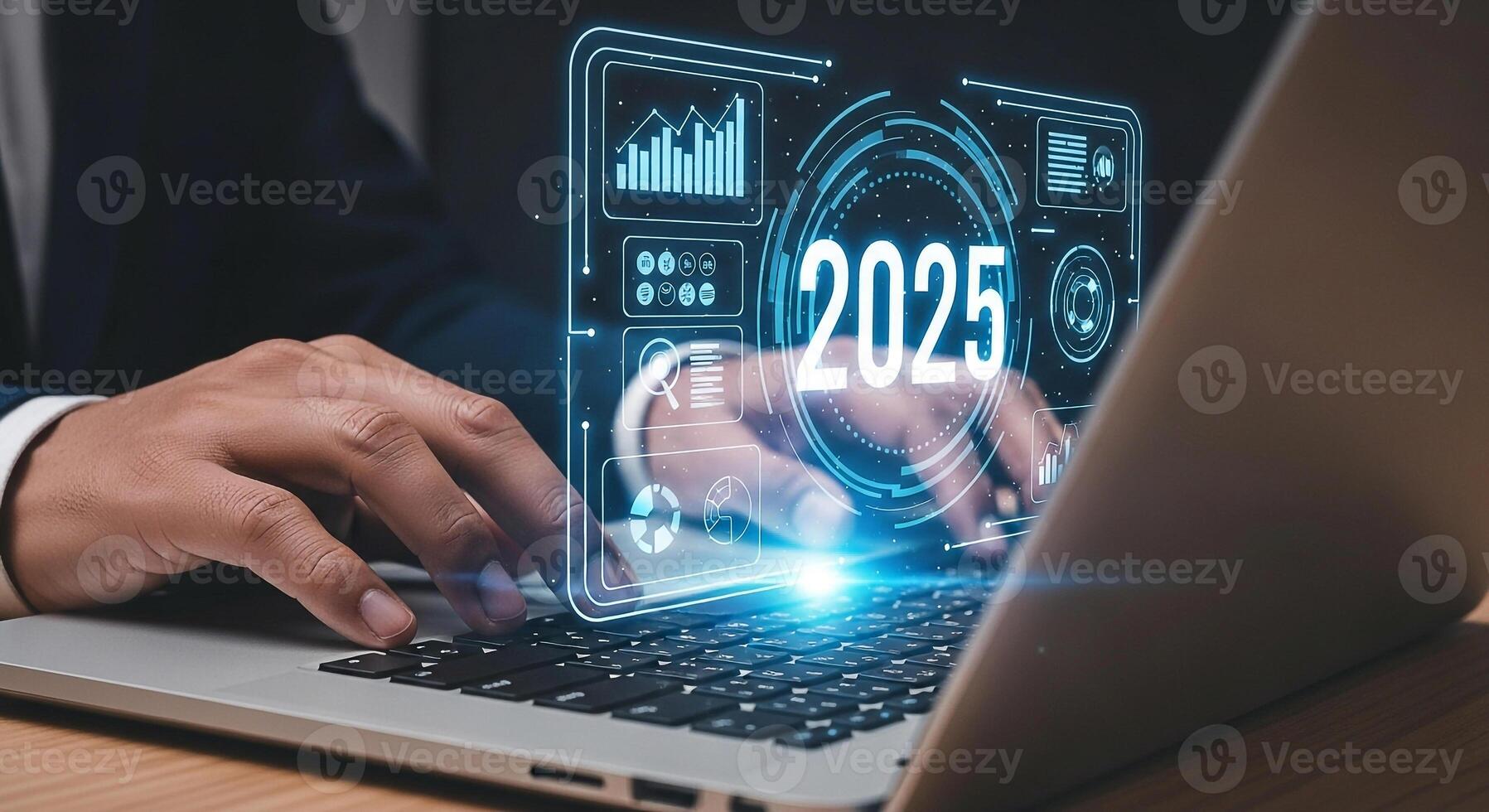 Businessman using laptop computer analyzing futuristic digital interface showing 2025 year projection planning future strategy innovative technology concept Pro Photo