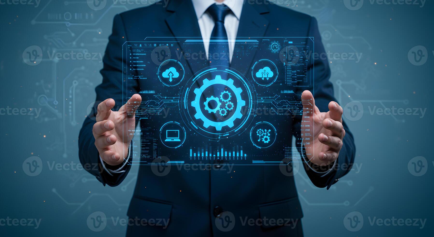 Businessman Presenting Futuristic Technology Interface Showing Cloud Computing Gears and Data Processing Symbolizing Innovation and Progress Pro Photo