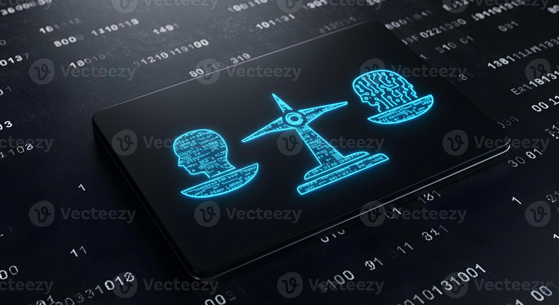 Digital Brain and Wind Turbine Balancing on a Futuristic Scale Displayed on a Screen with Binary Code Background Representing the Concept of Sustainable Energy and Artificial Intelligence Pro Photo