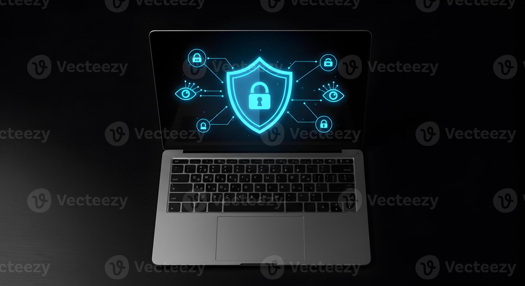 Cyber Security Protection Laptop Displaying a Glowing Shield and Lock Icon Representing Digital Safety and Data Privacy on a Dark Background Pro Photo