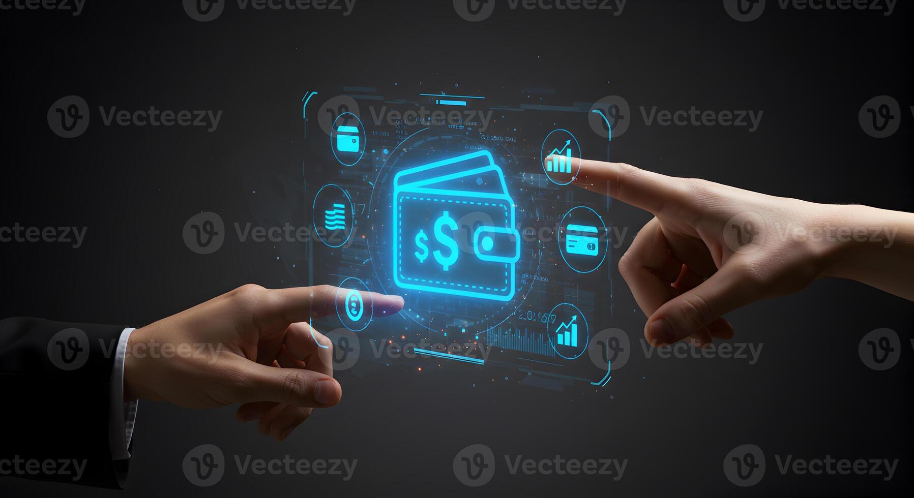 Digital Wallet Interface Two Hands Interacting with a Futuristic Holographic Digital Wallet Displaying Financial Data and Transaction Icons Pro Photo