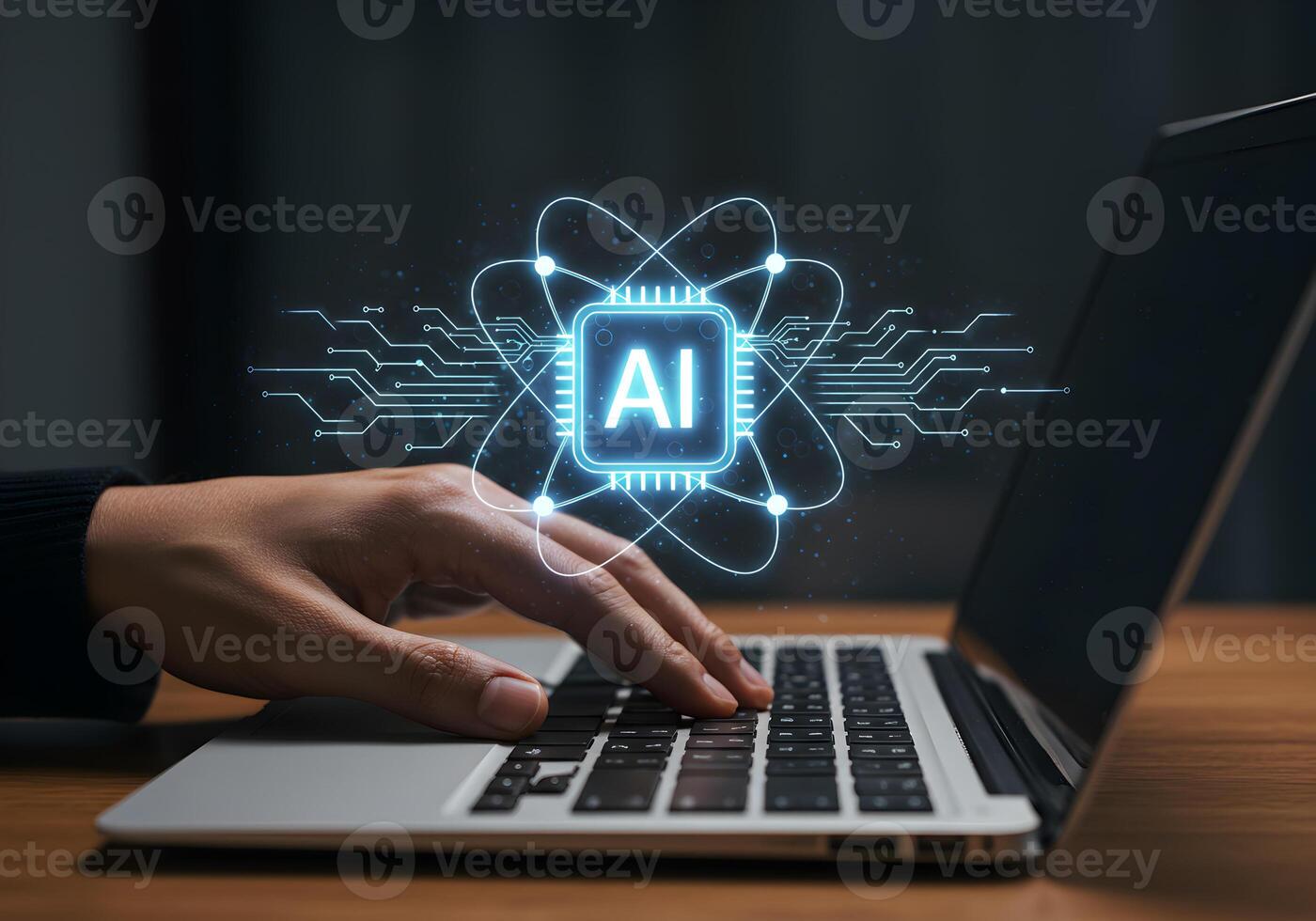 Person using laptop computer interacting with AI interface showcasing futuristic technology and innovation on a wooden desk at night The image evokes a sense of digital transformation and progress in Pro Photo