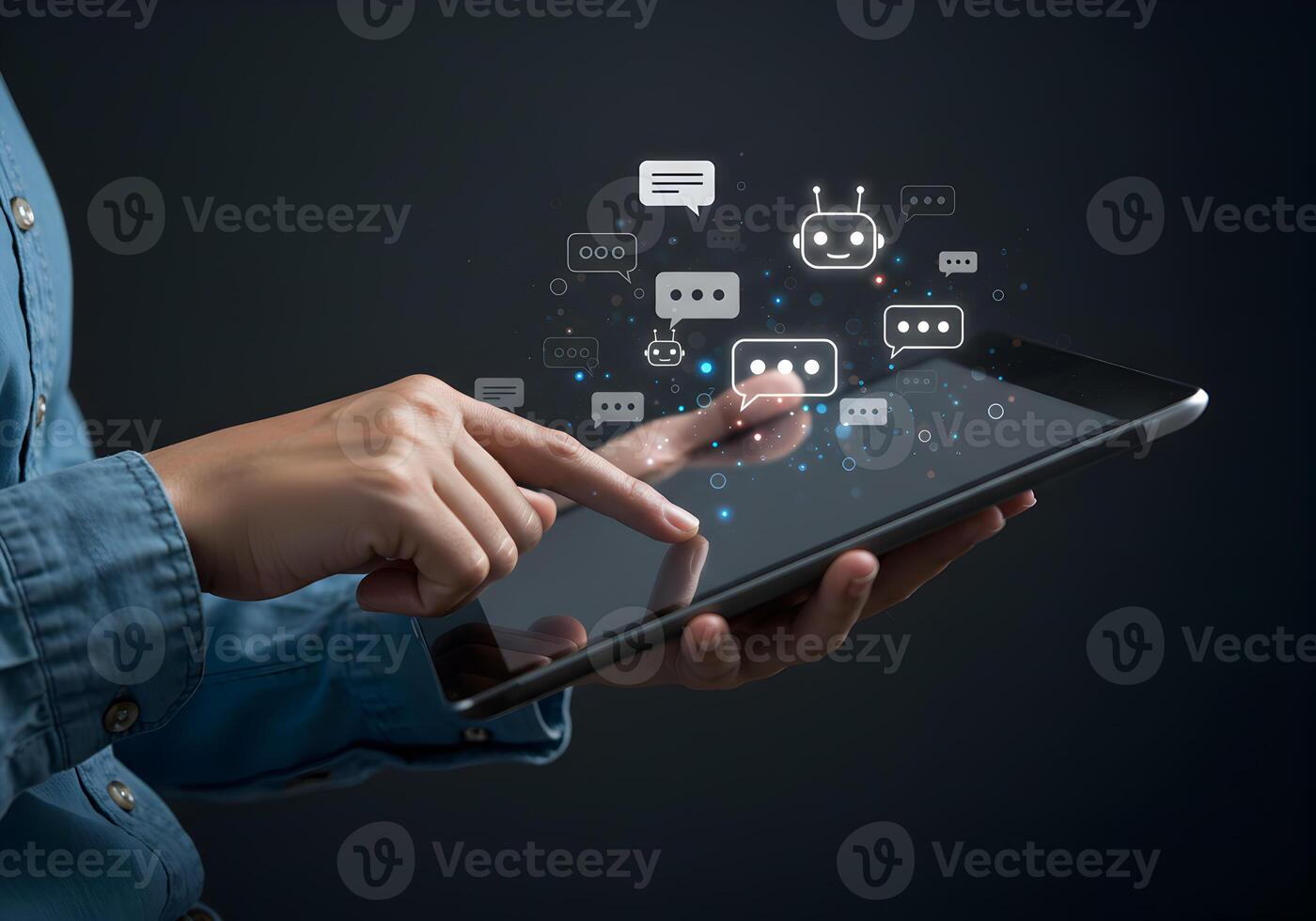 Woman using a digital tablet interacting with a chatbot interface filled with communication bubbles and AI icons exploring innovative digital communication technology Pro Photo