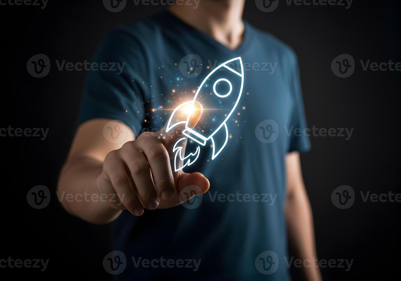 Man launching a rocket icon in dark setting symbolizing a successful startup new business launch innovation and fast growth The image represents progress ambition and the future of technology Pro Photo