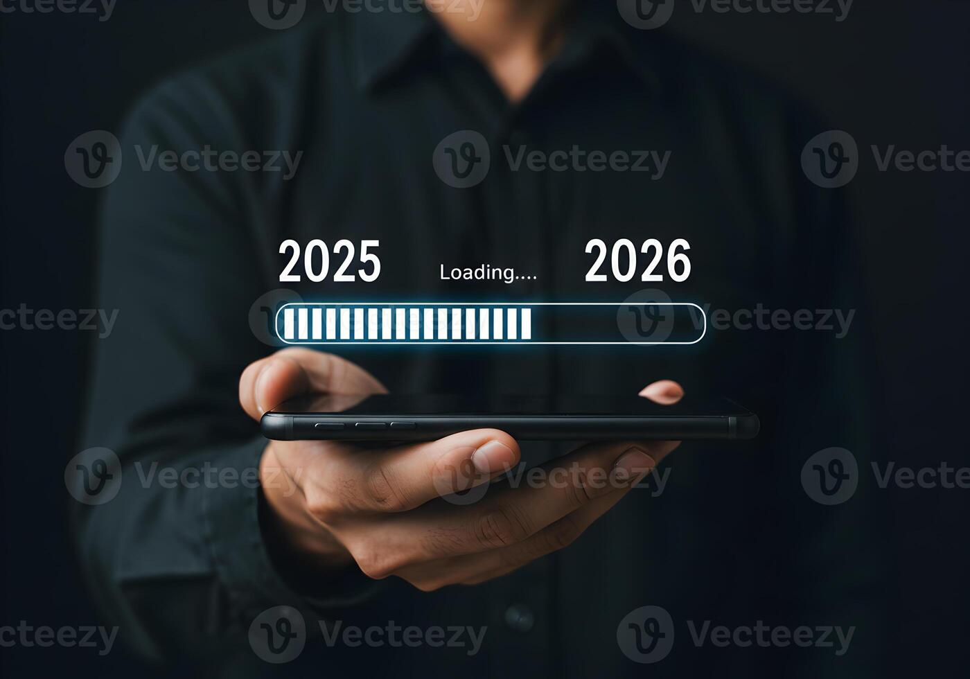 Person holding smartphone displaying a progress bar symbolizing the transition from 2025 to 2026 signifying anticipation for the new year and future opportunities Pro Photo