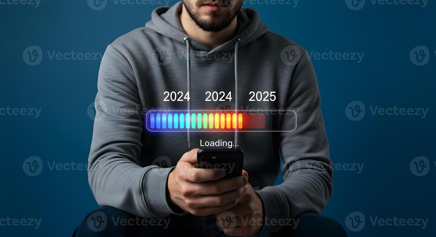 Man using smartphone viewing a progress bar showing loading for 2024 and 2025 against a deep blue background Concept of anticipation future planning and new year goals Pro Photo