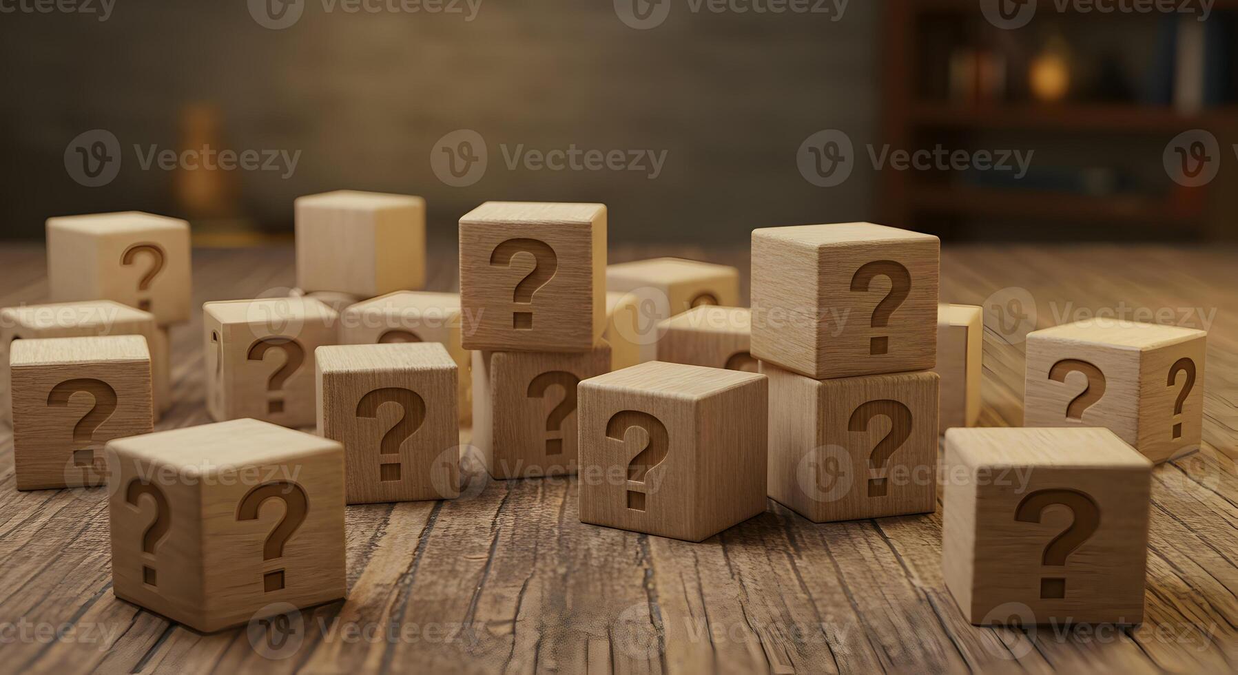 Wooden cubes with question marks scattered on a table representing uncertainty questions and the search for answers The image evokes a sense of mystery and intrigue perfect for concepts related to pro Pro Photo