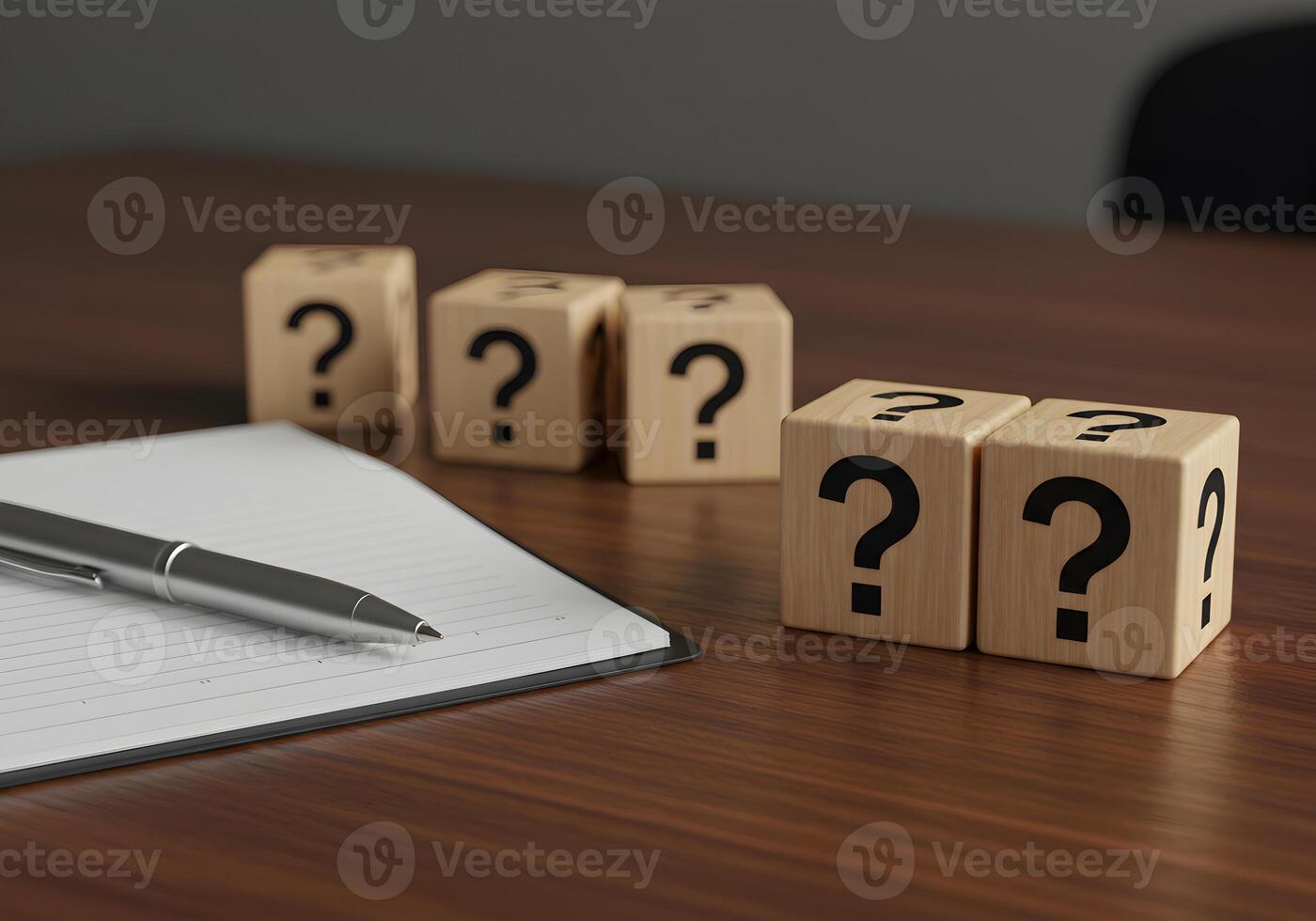 Wooden cubes with question marks on a desk near a notepad and pen signifying uncertainty questions and the search for answers Pro Photo