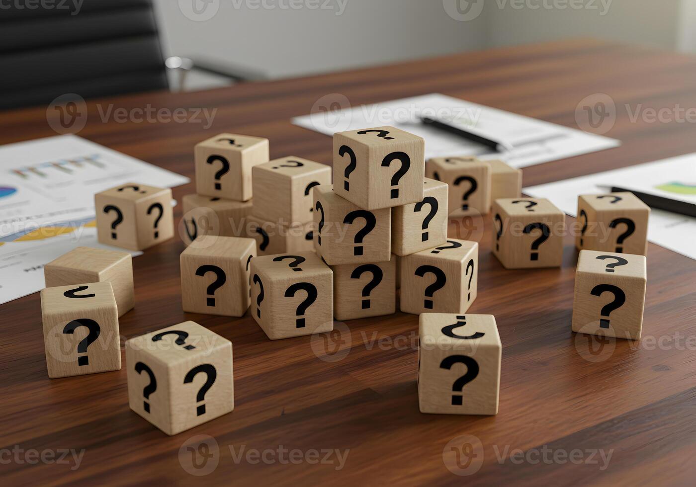 Wooden cubes with question marks stacked on a modern office desk symbolizing uncertainty doubt and the challenges of decisionmaking in business The image evokes a sense of mystery and intrigue ideal f Pro Photo