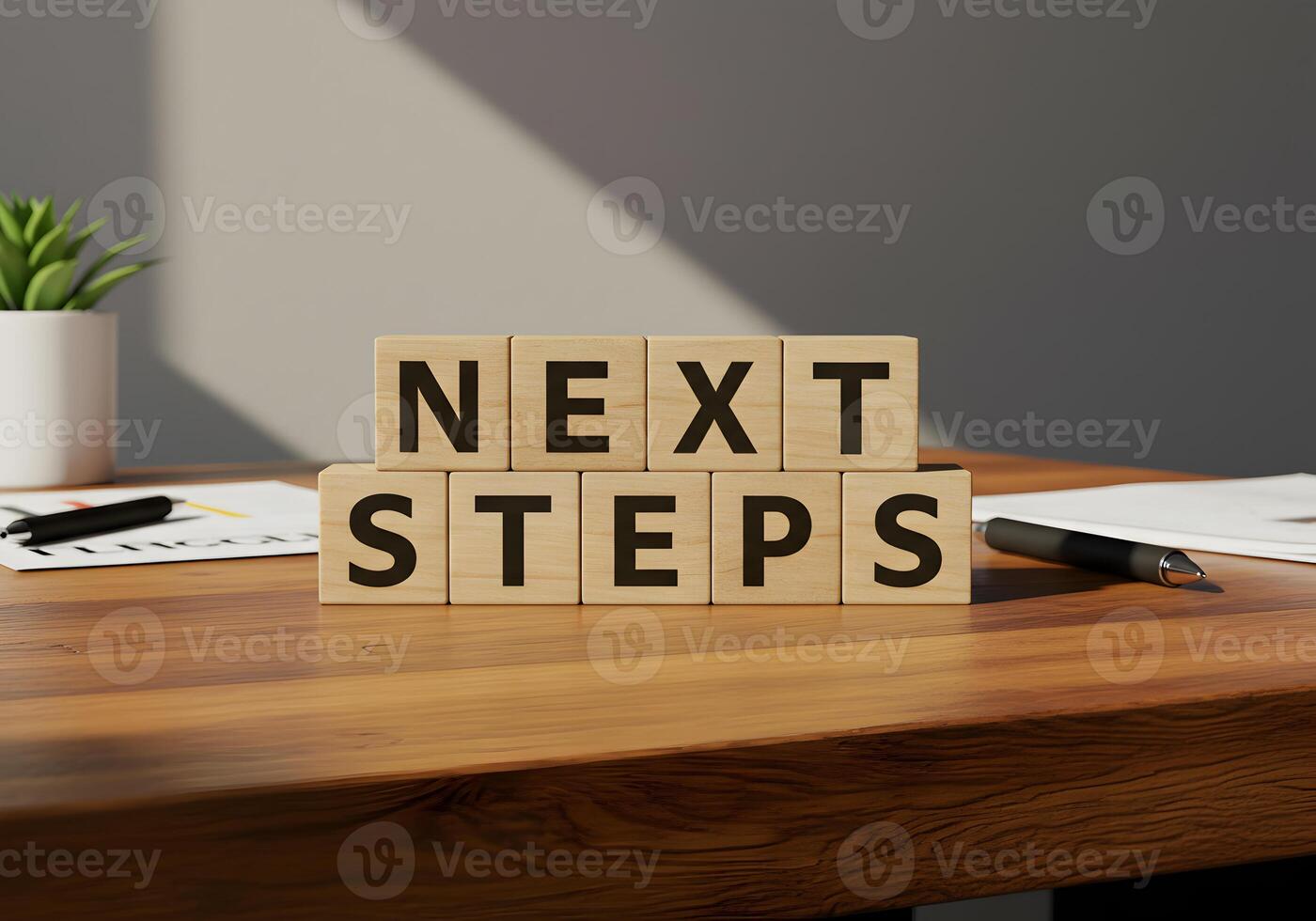 Wooden blocks spelling out Next Steps on a desk signifying planning strategy and future goals in a modern office setting The image evokes a sense of progress ambition and forwardthinking business conc Pro Photo
