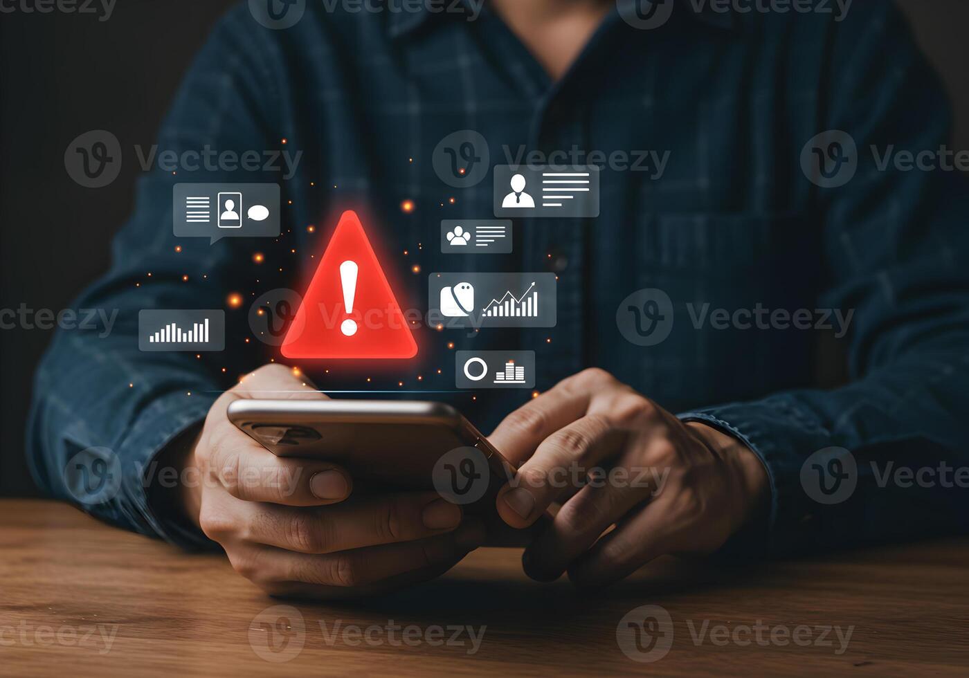 Person using smartphone receives a digital alert notification with warning sign and data icons on screen indicating a problem or error requiring immediate attention Pro Photo