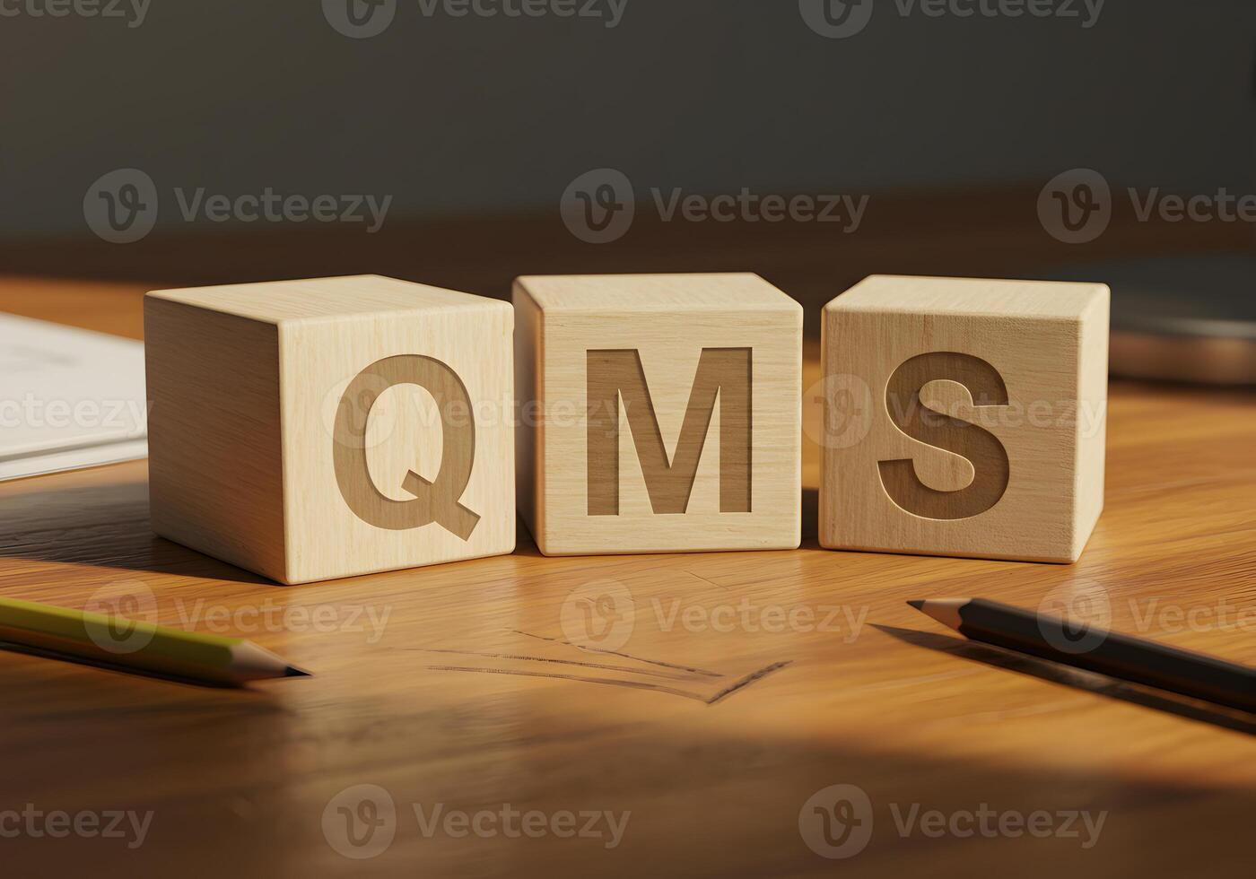 Wooden Blocks Spelling QMS on a Desk Representing Quality Management System in a Business Office Setting Symbolizing Process Improvement and Quality Control Pro Photo