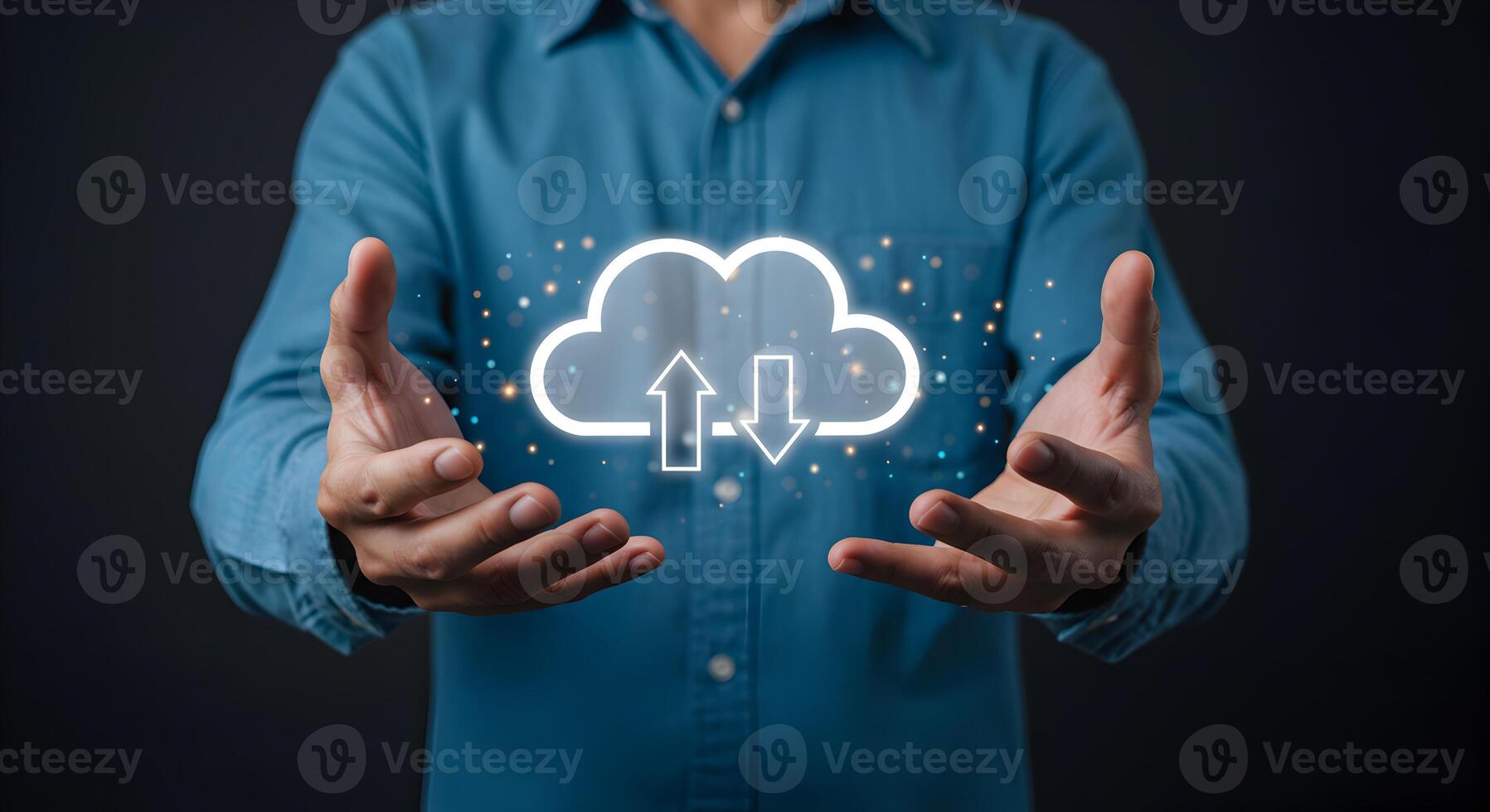 Man Presenting Cloud Computing Data Transfer Concept Uploading and Downloading Files Digital Transformation Modern Technology Pro Photo