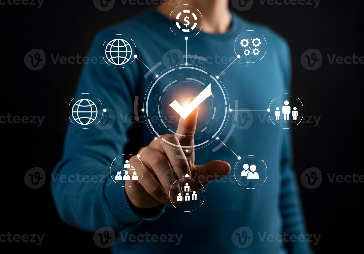 Person activating a digital interface showing a check mark symbolizing successful project completion team collaboration and global connectivity The image conveys a sense of accomplishment and efficien Pro Photo