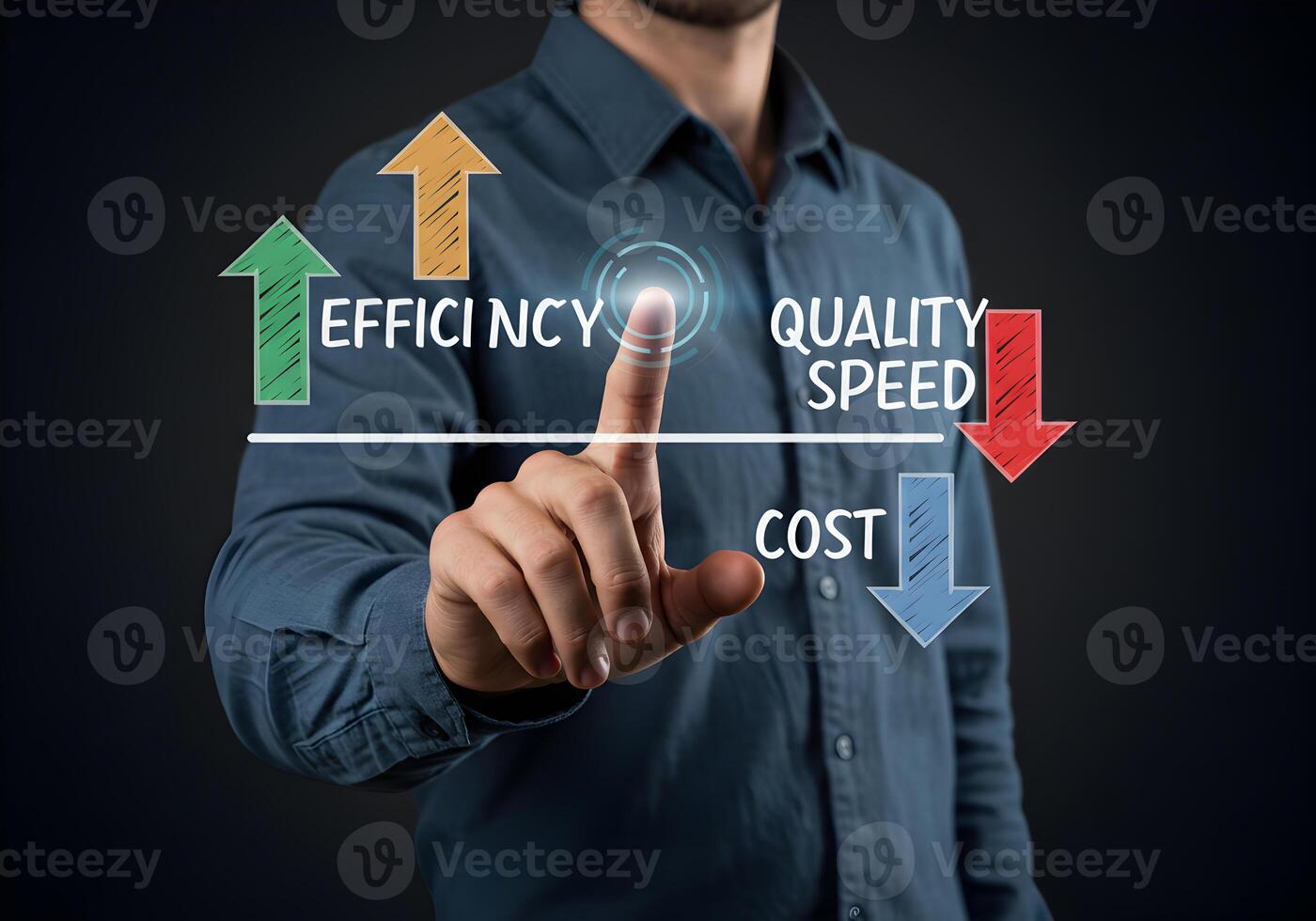 Man Optimizing Efficiency and Quality Reducing Costs and Speed in a Futuristic Business Setting Image depicts a businessman using a touchscreen interface to balance business priorities focusing on eff Pro Photo
