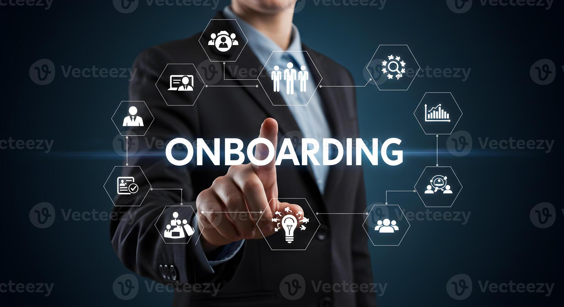 Businessperson using digital interface to manage onboarding process showing team collaboration workflow and training Concept of seamless employee integration and efficient HR Pro Photo