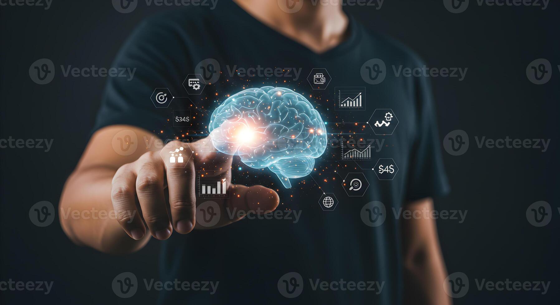 Person Interacting with a Futuristic Hologram of a Brain Analyzing Data and Business Intelligence Concept of Artificial Intelligence and Neural Networks Technology and Innovation Pro Photo