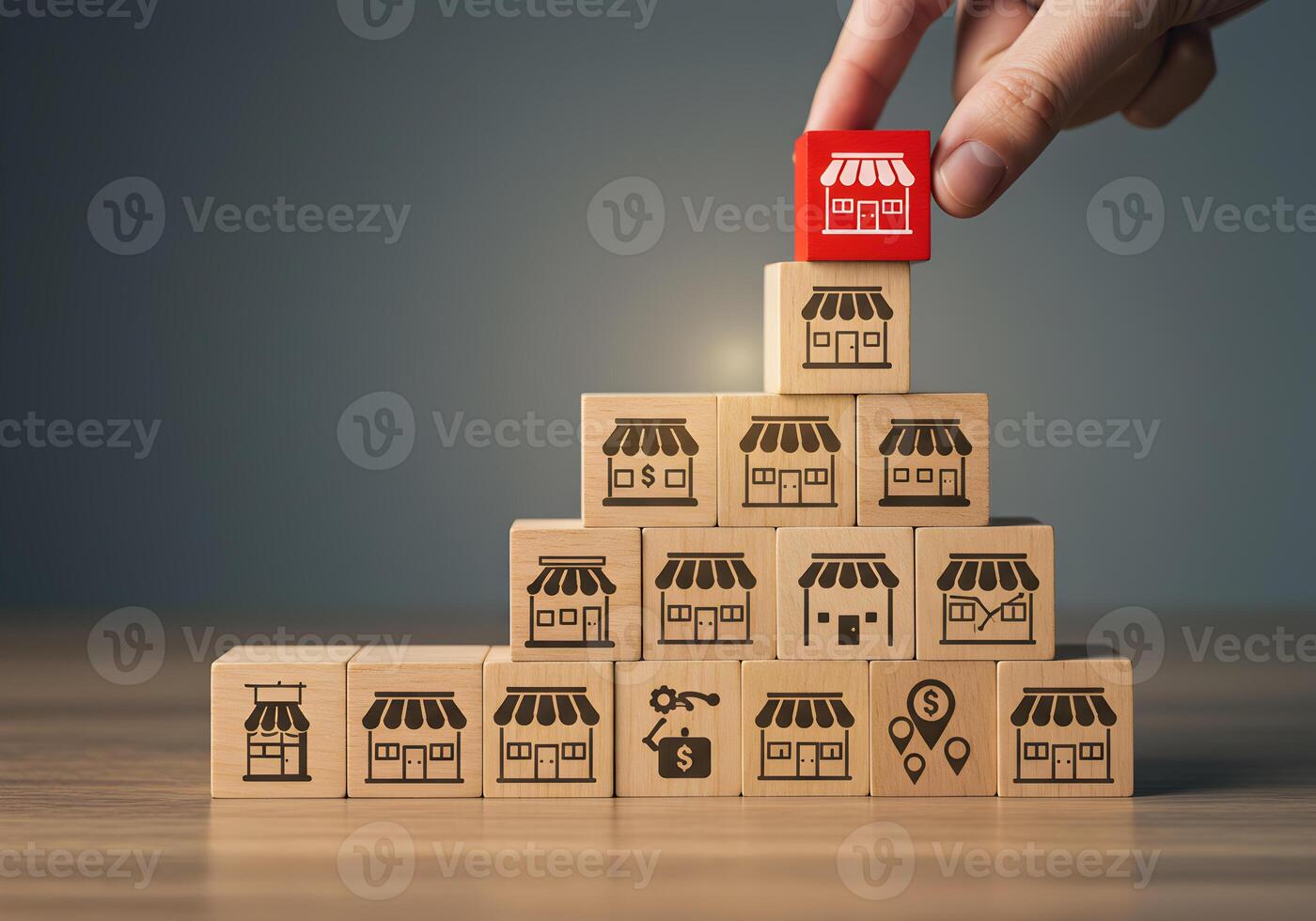 Hand placing a red block with store icon on top of a wooden block pyramid representing business growth and expansion strategy The concept illustrates increasing sales market share and building a succe Pro Photo