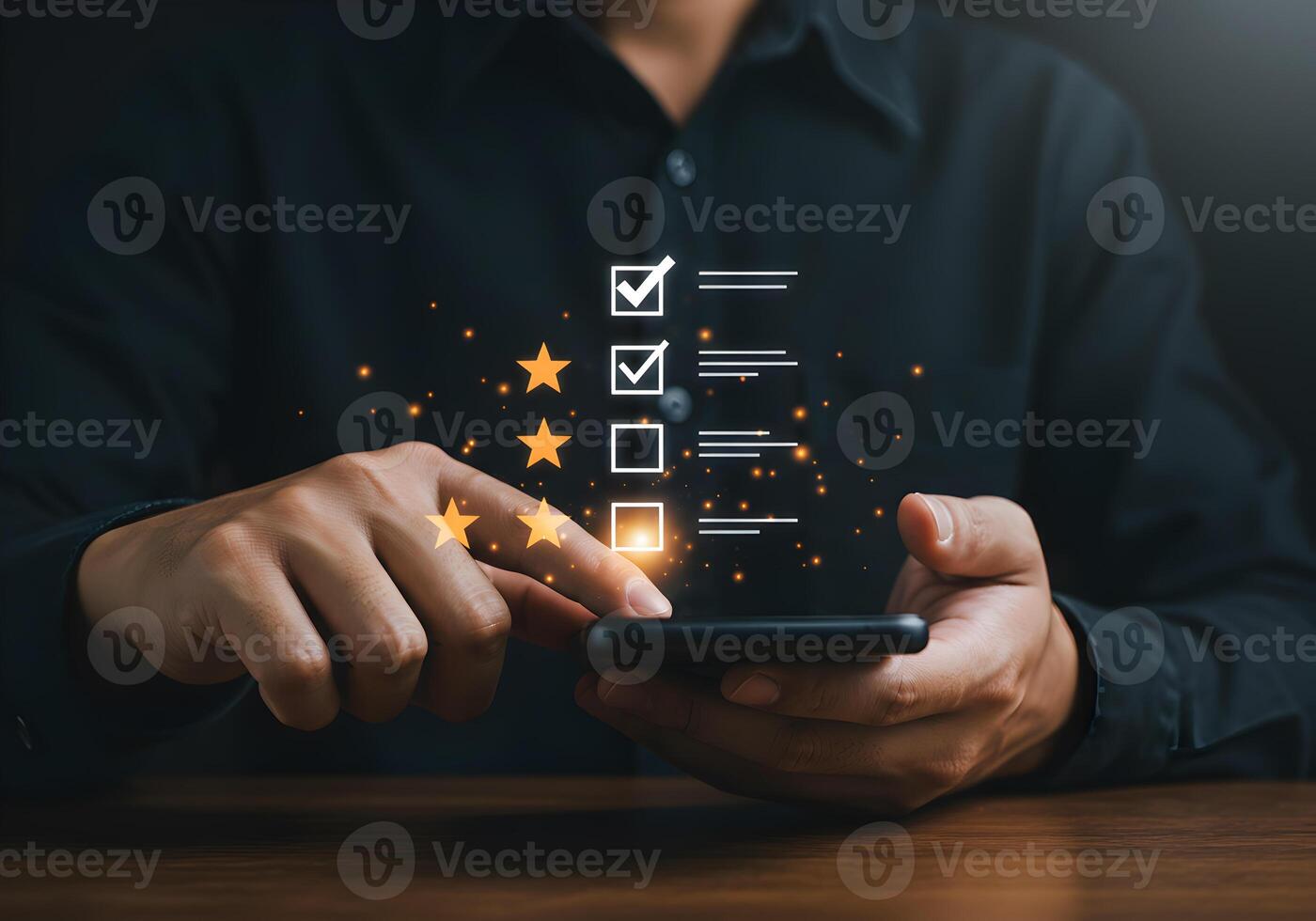 Person using smartphone to review checklist and rating stars evaluating feedback quality control customer satisfaction online survey digital assessment mobile app dark background glowing interface pos Pro Photo